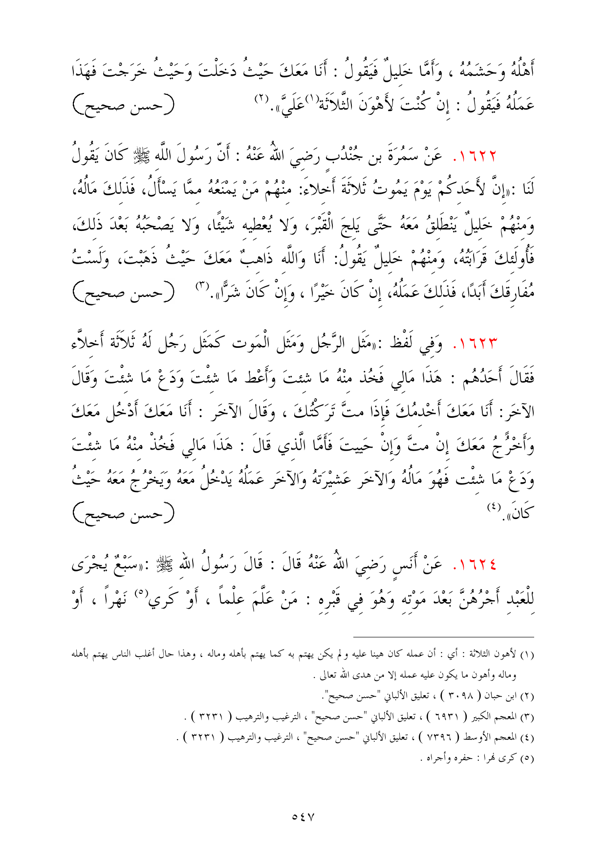 1624 - عَنْ أَنَسٍ رَضِيَ اللهُ عَنْهُ قَالَ: قَالَ رَسُولُ اللهِ - صلى الله عليه وسلم -: «سَبْعٌ يُجْرَى لِلْعَبْدِ أَجْرُهُنَّ بَعْدَ مَوْتِهِ وَهُوَ فِي قَبْرِهِ: مَنْ عَلَّمَ عِلْماً، أَوْ كَري (¬5) نَهْراً، أَوْ