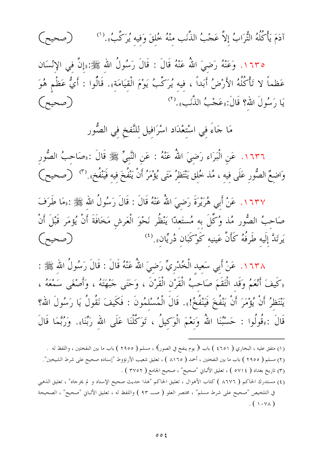 1638 - عَنْ أَبِي سَعِيدٍ الْخُدْرِيِّ رَضِيَ اللهُ عَنْهُ قَالَ: قَالَ رَسُولُ اللهِ - صلى الله عليه وسلم -: «كَيفَ أَنْعَمُ وَقَدِ الْتَقَمَ صَاحِبُ الْقَرْنِ الْقَرْنَ، وَحَنَى جَبْهَتَهُ، وَأَصْغَى سَمْعَهُ، يَنْتَظِرُ أَنْ يُؤْمَرَ أَنْ يَنْفُخَ فَيَنْفُخُ!». قَالَ الْمُسْلِمُونَ: فَكَيفَ نَقُولُ يَا رَسُولَ الله؟ قَالَ: «قُولُوا: حَسْبُنَا اللهُ وَنِعْمَ الْوَكِيلُ، تَوَكَّلْنَا عَلَى اللهِ رَبِّنَا». وَرُبَّمَا قَالَ