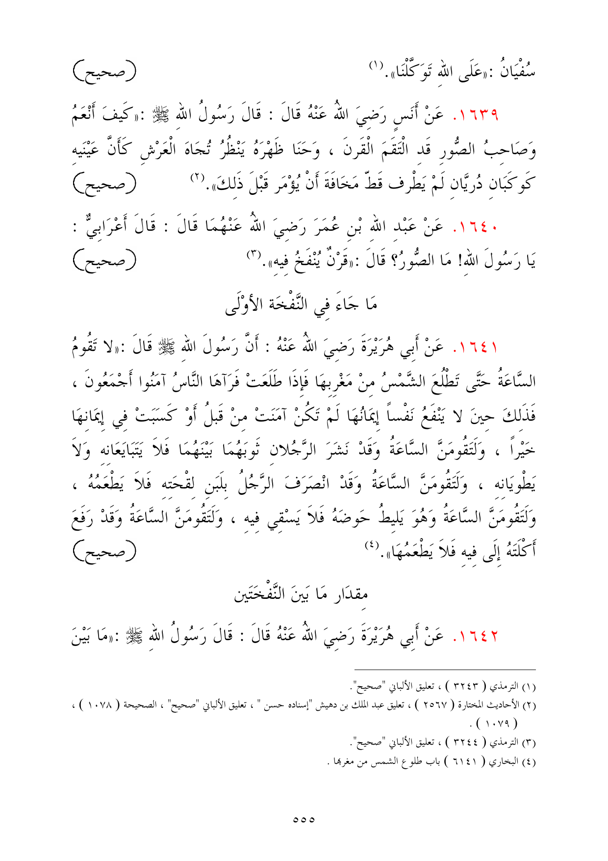 1640 - عَنْ عَبْدِ اللهِ بْنِ عُمَرَ رَضِيَ اللهُ عَنْهُمَا قَالَ: قَالَ أَعْرَابِيٌّ: يَا رَسُولَ اللهِ! مَا الصُّورُ؟ قَالَ: «قَرْنٌ يُنْفَخُ فِيهِ». (¬3) =صحيح