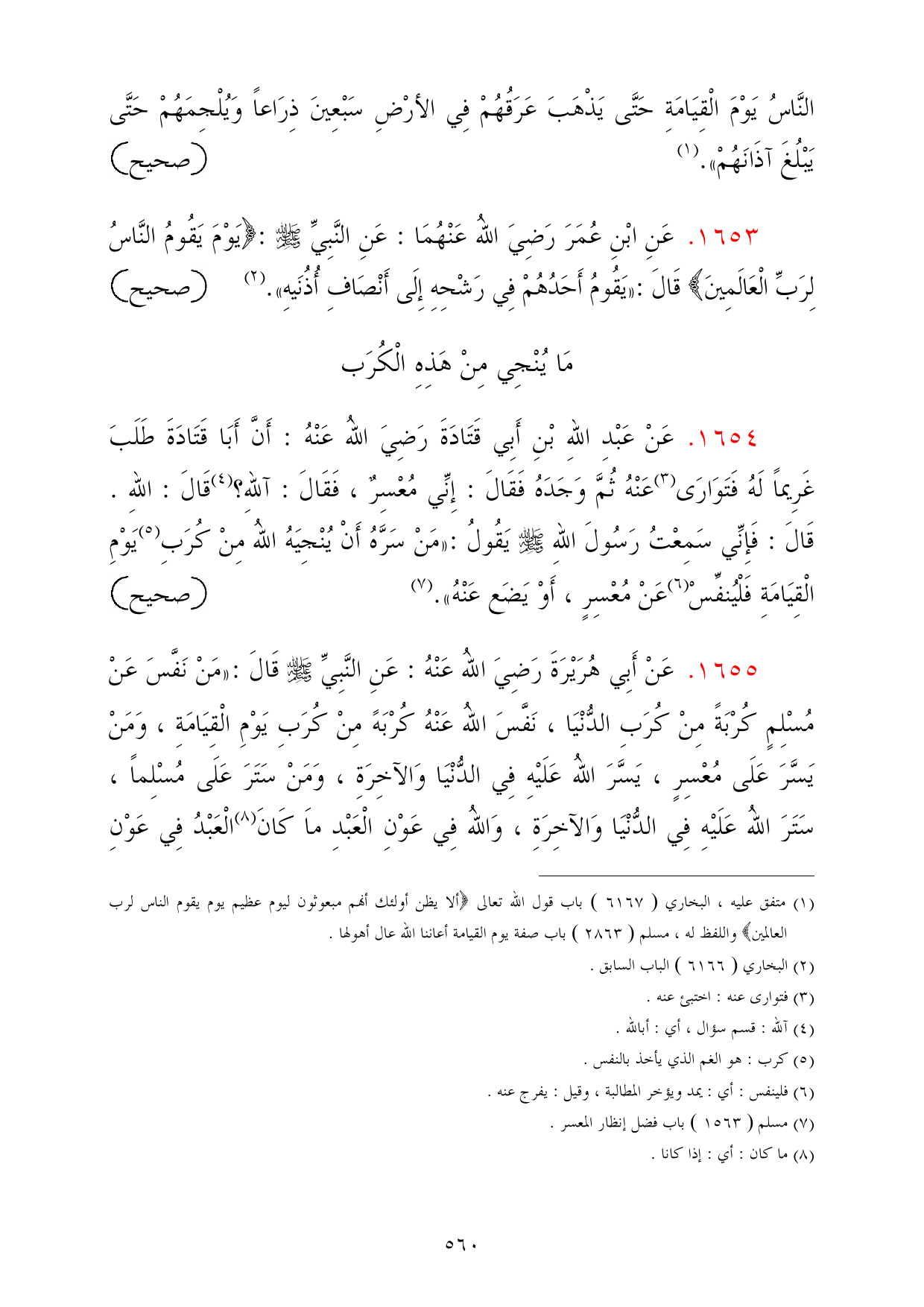 1655 - عَنْ أَبِي هُرَيْرَةَ رَضِيَ اللهُ عَنْهُ: عَنِ النَّبِيِّ - صلى الله عليه وسلم - قَالَ: «مَنْ نَفَّسَ عَنْ مُسْلِمٍ كُرْبَةً مِنْ كُرَبِ الدُّنْيَا، نَفَّسَ اللهُ عَنْهُ كُرْبَهً مِنْ كُرَبِ يَوْمِ الْقِيَامَةِ، وَمَنْ يَسَّرَ عَلَى مُعْسِرٍ، يَسَّرَ اللهُ عَلَيْهِ فِي الدُّنْيَا وَالآخِرَةِ، وَمَنْ سَتَرَ عَلَى مُسْلِماً، سَتَرَ اللهُ عَلَيْهِ فِي الدُّنْيَا وَالآخِرَةِ، وَاللهُ فِي عَوْنِ الْعَبْدِ ماَ كَانَ (¬8) الْعَبْدُ فِي عَوْنِ