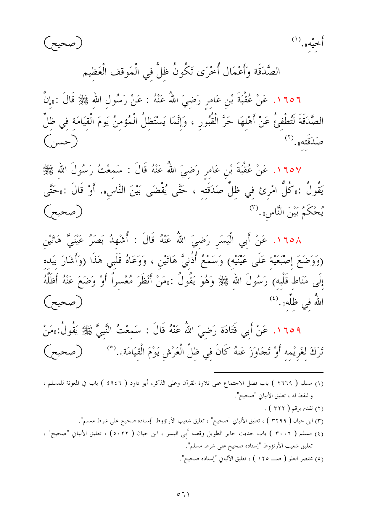 1659 - عَنْ أَبِي قَتَادَة رَضِيَ اللهُ عَنْهُ قَالَ: سَمِعْتُ النَّبِيَّ - صلى الله عليه وسلم - يَقُولُ: «مَنْ تَرَكَ لِغَرِيْمِهِ أَوْ تَجَاوَزَ عَنهُ كَانَ فِي ظِلِّ الْعَرْشِ يَوْمَ الْقِيَامَة». (¬5) =صحيح