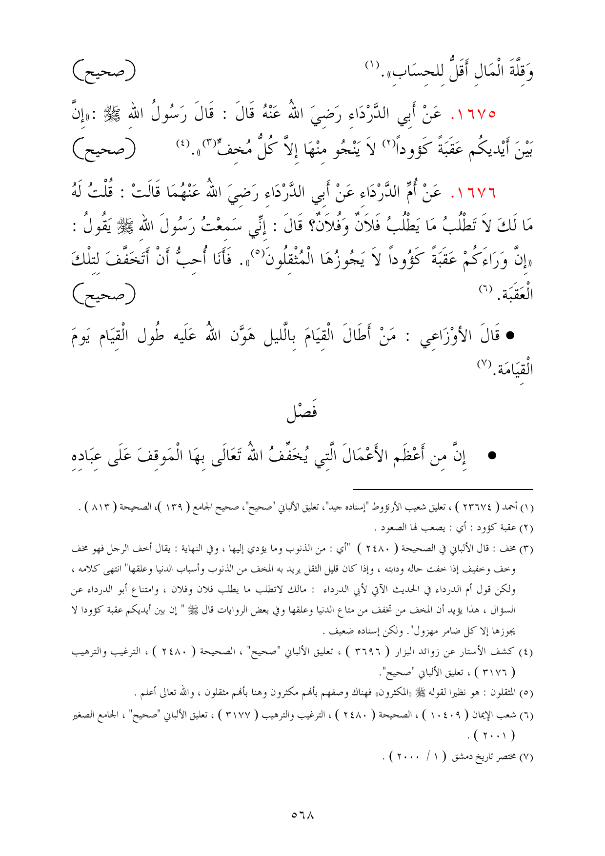 (¬3) مخف: قال الألباني في الصحيحة (2480 ("أي: من الذنوب وما يؤدي إليها، وفي النهاية: يقال أخف الرجل فهو مخف وخف وخفيف إذا خفت حاله ودابته، وإذا كان قليل الثقل يريد به المخف من الذنوب وأسباب الدنيا وعلقها" انتهى كلامه، ولكن قول أم الدرداء في الحديث الآتي لأبي الدرداء: مالك لاتطلب ما يطلب فلان وفلان، وامتناع أبو الدرداء عن السؤال، هذا يؤيد أن المخف من تخفف من متاع الدنيا وعلقها وفي بعض الروايات قال - صلى الله عليه وسلم - " إن بين أيديكم عقبة كؤودا لا يجوزها إلا كل ضامر مهزول". ولكن إسناده ضعيف.