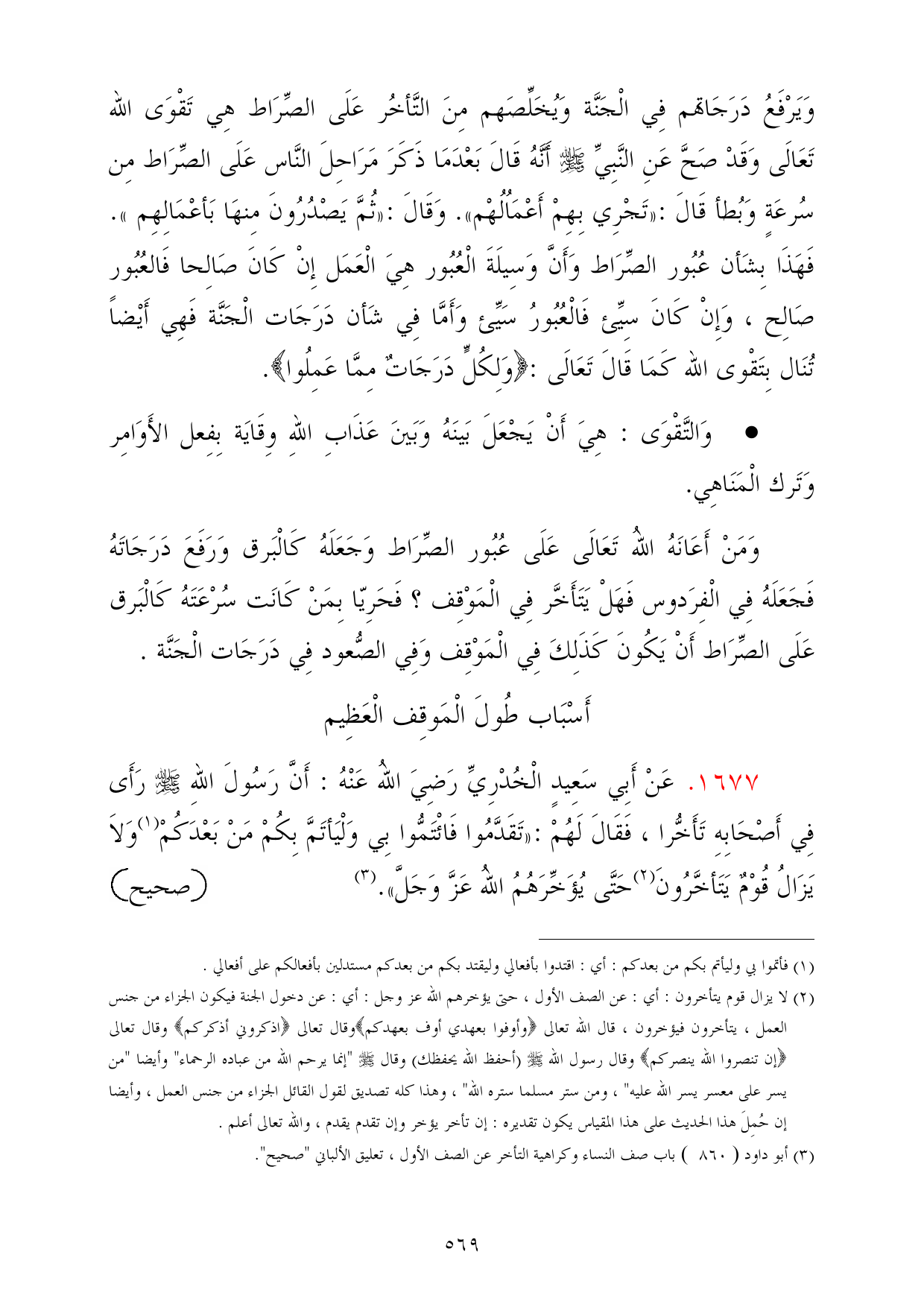 1677 - عَنْ أَبِي سَعِيدٍ الْخُدْرِيِّ رَضِيَ اللهُ عَنْهُ: أَنَّ رَسُولَ اللهِ - صلى الله عليه وسلم - رَأَى فِي أَصْحَابِهِ تَأَخُّرا، فَقَالَ لَهُمْ: «تَقَدَّمُوا فَائْتَمُّوا بِي وَلْيَأتَمَّ بِكُمْ مَنْ بَعْدَكُمْ (¬1) وَلاَ يَزَالُ قُوْمٌ يَتَأخَّرُونَ (¬2) حَتَّى يُؤَخِّرَهُمُ اللهُ عَزَّ وَجَلَّ». (¬3) =صحيح