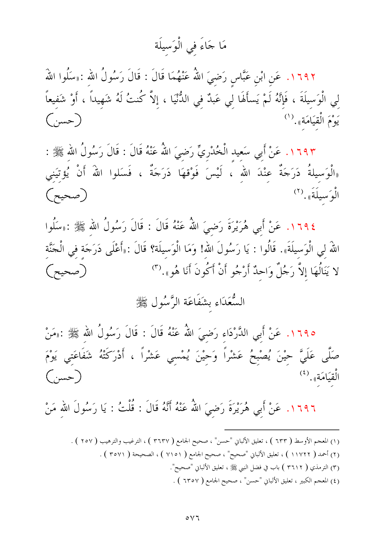 1693 - عَنْ أَبِي سَعِيدٍ الْخُدْرِيِّ رَضِيَ اللهُ عَنْهُ قَالَ: قَالَ رَسُولُ اللهِ - صلى الله عليه وسلم -: «الْوَسِيلةُ دَرَجَةٌ عِنْدَ اللهِ، لَيْسَ فَوْقهَا دَرَجَةٌ، فَسَلوا اللهَ أَنْ يُؤتِيَنِي الْوَسِيلَةَ». (¬2) =صحيح