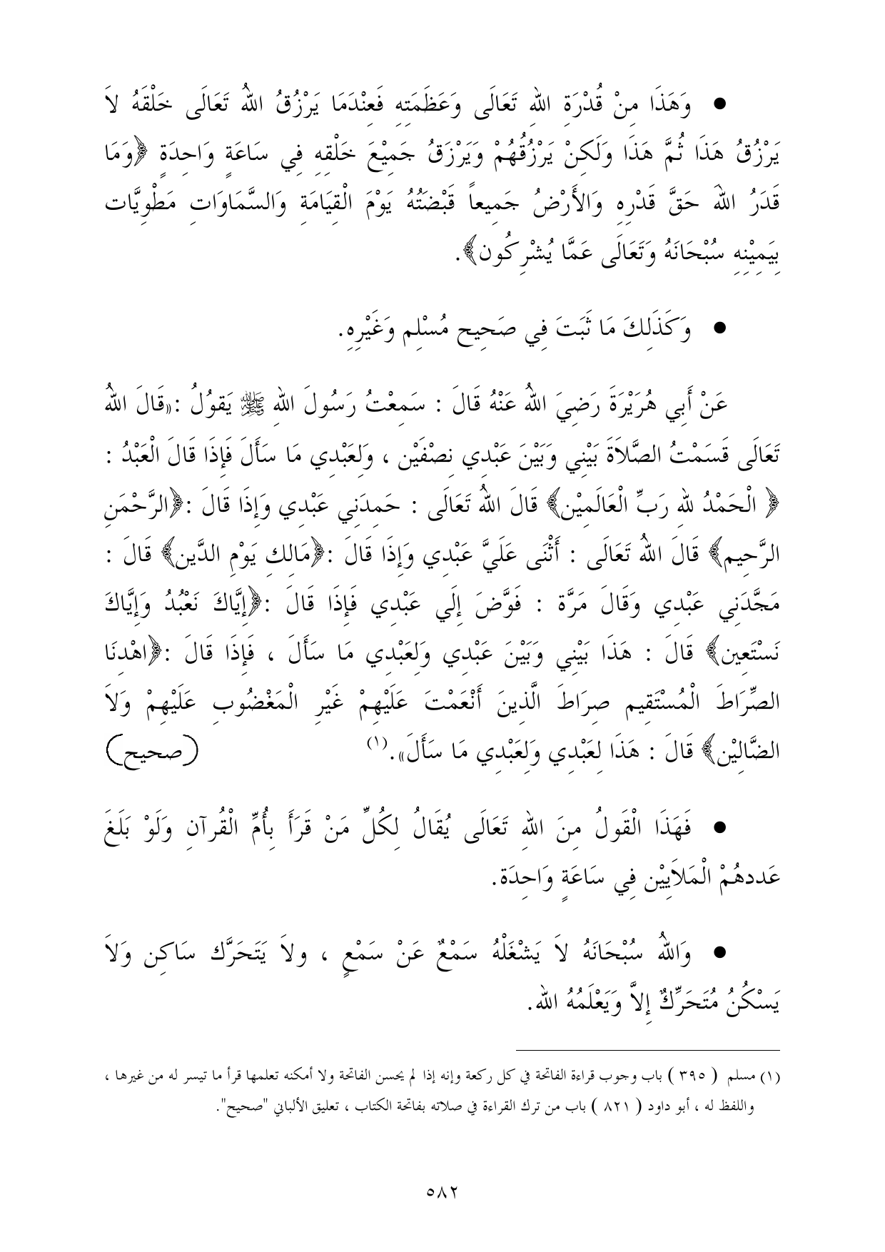 عَنْ أَبِي هُرَيْرَةَ رَضِيَ اللهُ عَنْهُ قَالَ: سَمِعْتُ رَسُولَ اللهِ - صلى الله عليه وسلم - يَقوُلُ: «قَالَ اللهُ تَعَالَى قَسَمْتُ الصَّلاَةَ بَيْنِي وَبَيْنَ عَبْدِي نِصْفَيْن، وَلِعَبْدِي مَا سَأَلَ فَإِذَا قَالَ الْعَبْدُ: {الْحَمْدُ للهِ رَبِّ الْعَالَمِيْن} قَالَ اللهُ تَعَالَى: حَمِدَنِي عَبْدِي وَإِذَا قَالَ: {الرَّحْمَنِ الرَّحِيم} قَالَ اللهُ تَعَالَى: أَثْنَى عَلَيَّ عَبْدِي وَإِذَا قَالَ: {مَالِكِ يَوْمِ الدَّين} قَالَ: مَجَّدَنِي عَبْدِي وَقَالَ مَرَّة: فَوَّضَ إِلَي عَبْدِي فَإِذَا قَالَ: {إِيَّاكَ نَعْبُدُ وَإِيَّاكَ نَسْتَعِين} قَالَ: هَذَا بَيْنِي وَبَيْنَ عَبْدِي وَلِعَبْدِي مَا سَأَلَ، فَإِذَا قَالَ: {اهْدِنَا الصِّرَاطَ الْمُسْتَقِيم صِرَاطَ الَّذِينَ أَنْعَمْتَ عَلَيْهِمْ غَيْرِ الْمَغْضُوبِ عَلَيْهِمْ وَلاَ الضَّالِيْن} قَالَ: هَذَا لِعَبْدِي وَلِعَبْدِي مَا سَأَلَ». (¬1) =صحيح