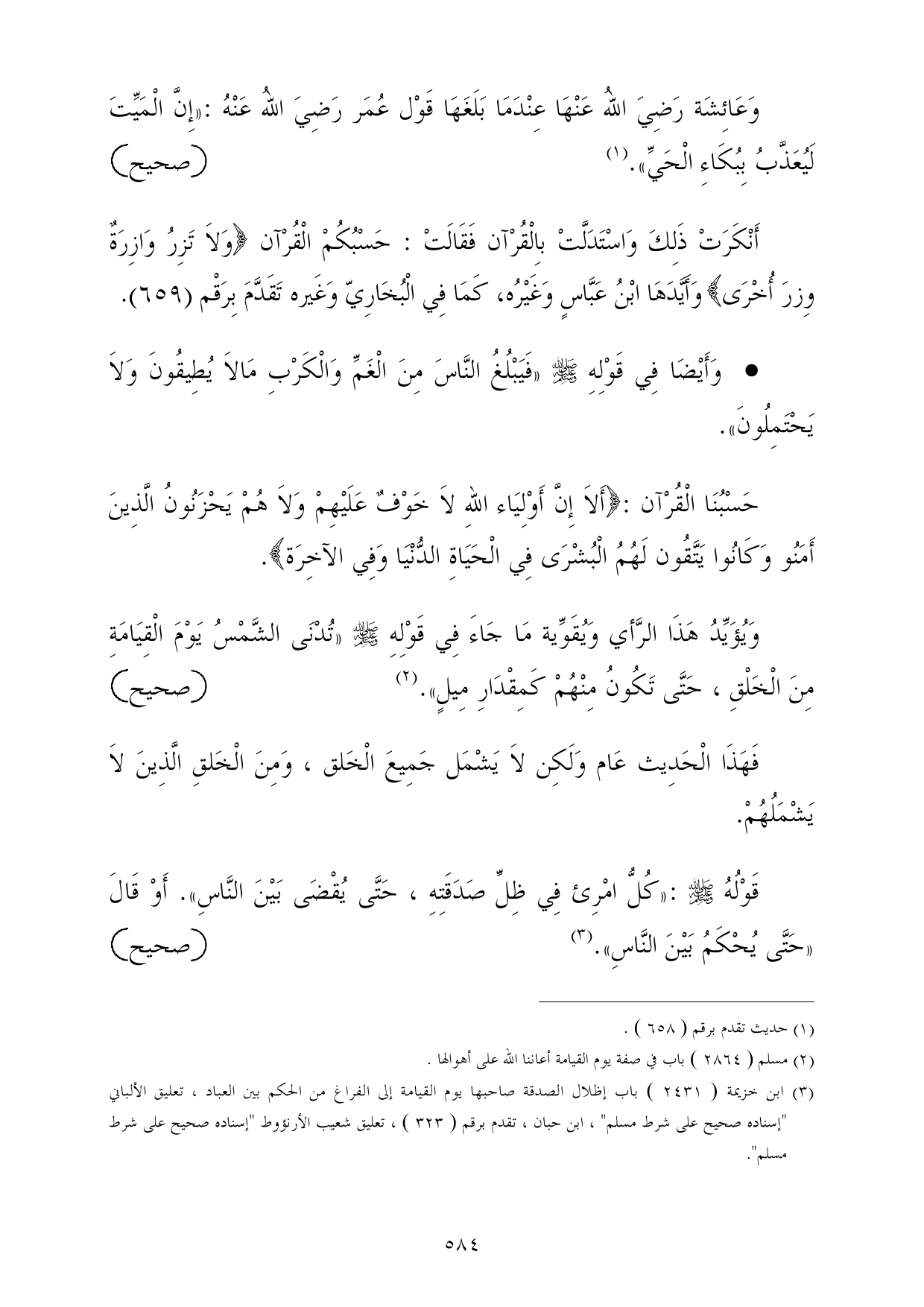 وَعَائِشَة رَضِيَ اللهُ عَنْهَا عِنْدَمَا بَلَغَهَا قَوْل عُمَر رَضِيَ اللهُ عَنْهُ: «إِنَّ الْمَيِّتَ لَيُعَذَّبُ بِبُكَاءِ الْحَيِّ». (¬1) =صحيح