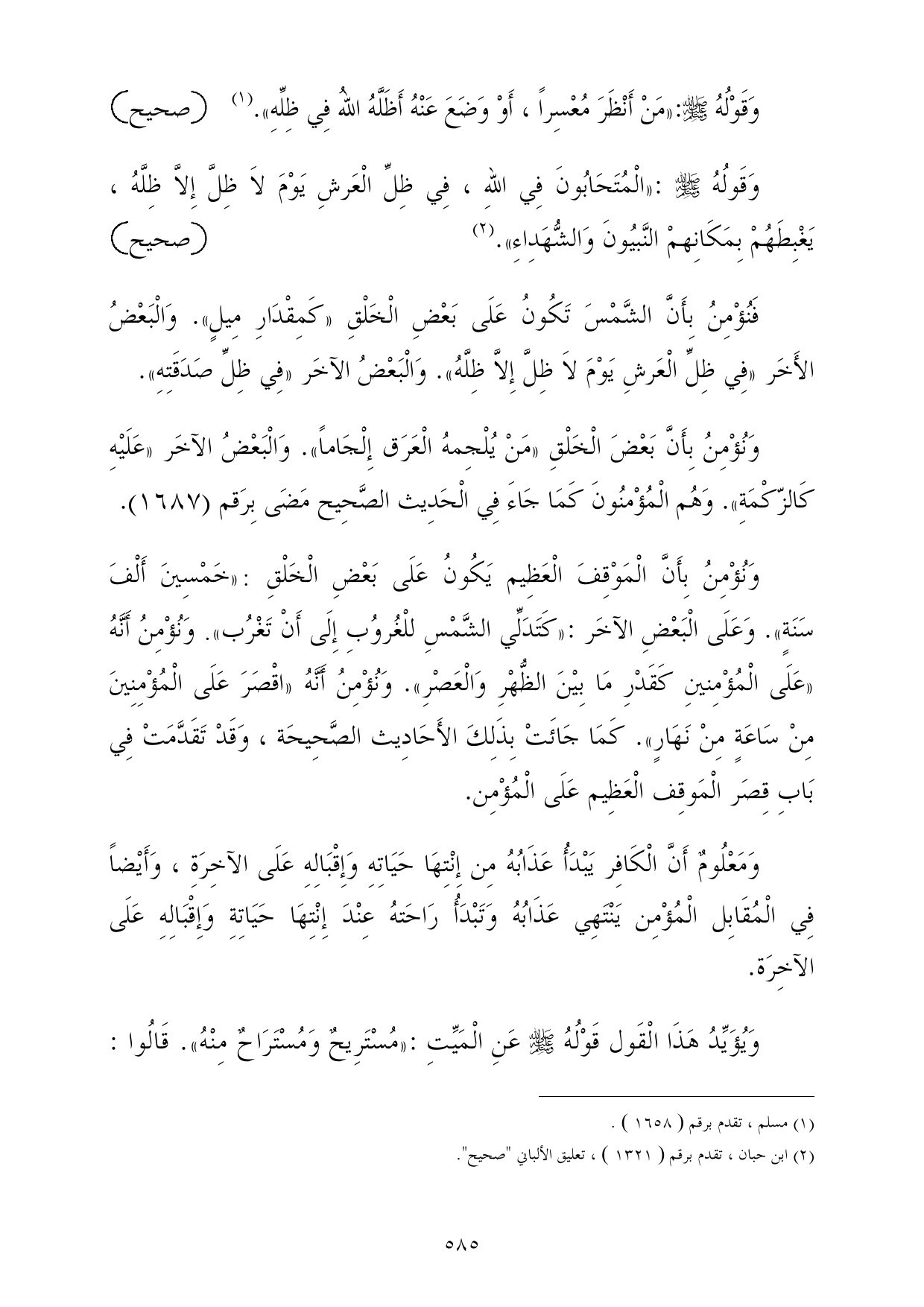 فَنُؤْمِنُ بِأَنَّ الشَّمْسَ تَكُونُ عَلَى بَعْضِ الْخَلْقِ «كَمِقْدَارِ مِيلٍ». وَالْبَعْضُ الأَخَر «فِي ظِلِّ الْعَرشِ يَوْمَ لاَ ظِلَّ إِلاَّ ظِلَّهُ». وَالْبَعْضُ الآخَر «فِي ظِلِّ صَدَقَتِهِ».