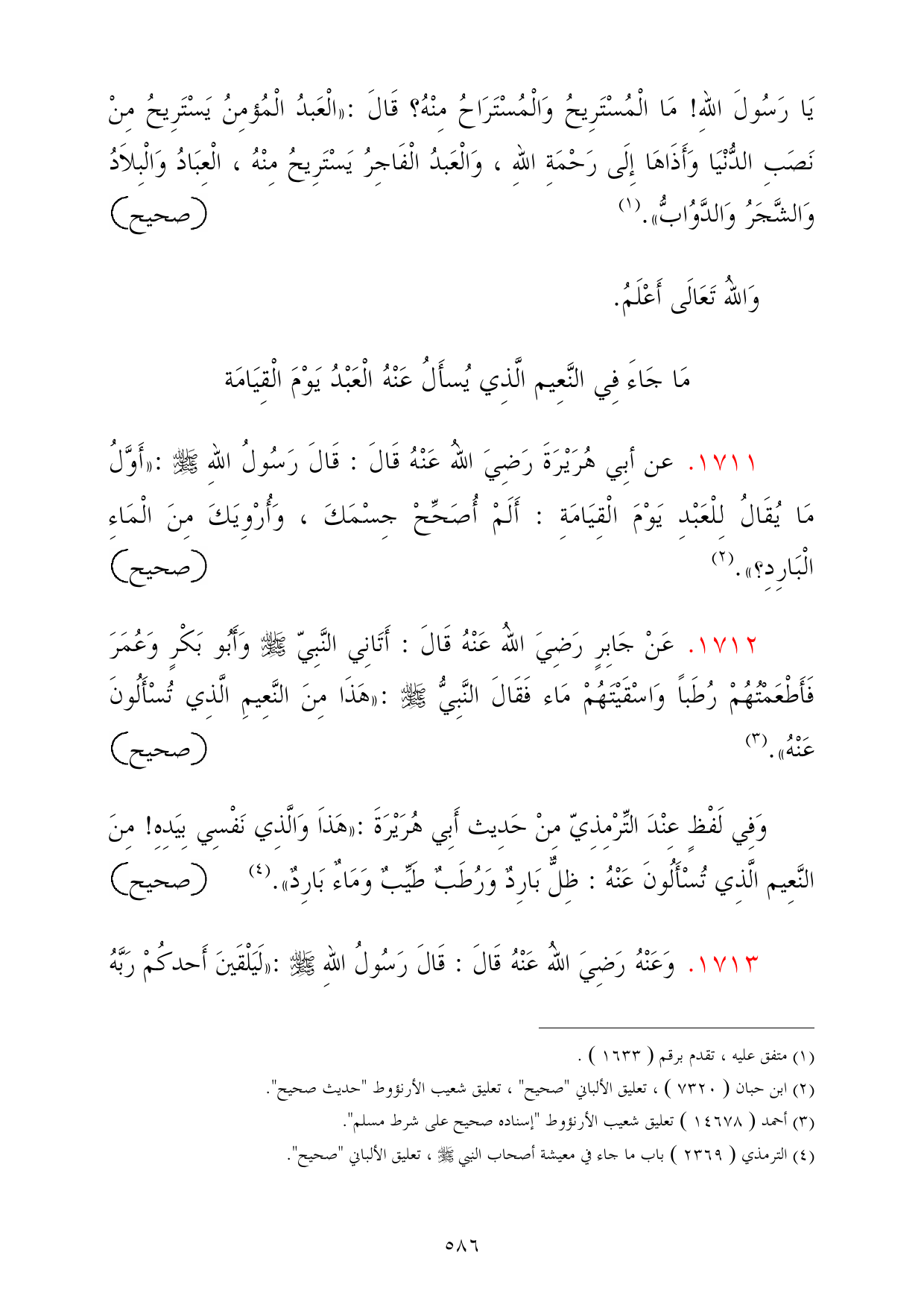 1711 - عن أبِي هُرَيْرَةَ رَضِيَ اللهُ عَنْهُ قَالَ: قَالَ رَسُولُ اللهِ - صلى الله عليه وسلم -: «أَوَّلُ مَا يُقَالُ لِلْعَبْدِ يَوْمَ الْقِيَامَةِ: أَلَمْ أُصَحِّحْ جِسْمَكَ، وَأُرْوِيَكَ مِنَ الْمَاءِ الْبَارِدِ؟». (¬2) =صحيح