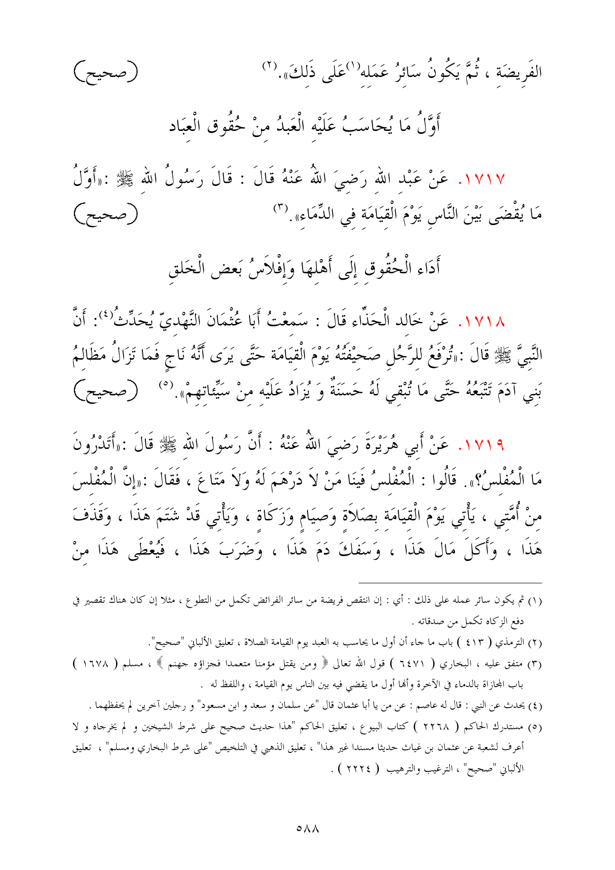 1719 - عَنْ أَبِي هُرَيْرَةَ رَضِيَ اللهُ عَنْهُ: أَنَّ رَسُولَ اللهِ - صلى الله عليه وسلم - قَالَ: «أَتَدْرُونَ مَا الْمُفْلِسُ؟». قَالُوا: الْمُفْلِسُ فَينَا مَنْ لاَ دَرْهَمَ لَهُ وَلاَ مَتَاعَ، فَقَالَ: «إِنَّ الْمُفْلِسَ مِنْ أُمَّتِي، يَأْتِي يَوْمَ الْقِيَامَةِ بِصَلاَةٍ وَصِيَامٍ وَزَكَاةٍ، وَيَأْتِي قَدْ شَتَمَ هَذَا، وَقَذَفَ هَذَا، وَأَكَلَ مَالَ هَذَا، وَسَفَكَ دَمَ هَذَا، وَضَرَبَ هَذَا، فَيُعْطَى هَذَا مِنْ