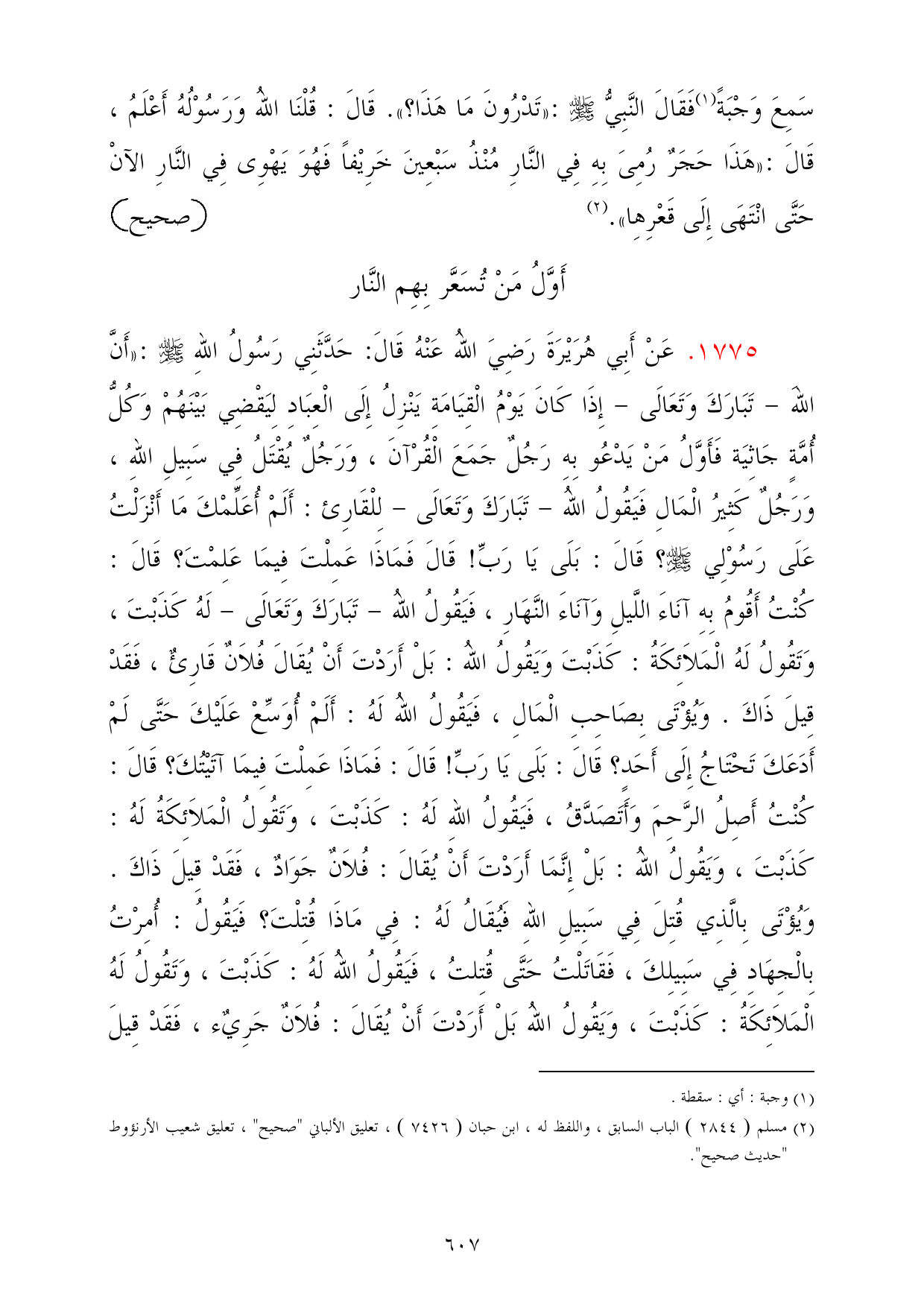 1775 - عَنْ أَبِي هُرَيْرَةَ رَضِيَ اللهُ عَنْهُ قَالَ: حَدَّثَنِي رَسُولُ اللهِ - صلى الله عليه وسلم -: «أَنَّ اللهَ - تَبَارَكَ وَتَعَالَى - إِذَا كَانَ يَوْمُ الْقِيَامَةِ يَنْزِلُ إِلَى الْعِبَادِ لِيَقْضِي بَيْنَهُمْ وَكُلُّ أُمَّةٍ جَاثِيَة فَأَوَّلُ مَنْ يَدْعُو بِهِ رَجُلٌ جَمَعَ الْقُرْآنَ، وَرَجُلٌ يُقْتَلُ فِي سَبِيلِ اللهِ، وَرَجُلٌ كَثِيرُ الْمَالِ فَيَقُولُ اللهُ - تَبَارَكَ وَتَعَالَى - لِلْقَارِئ: أَلَمْ أُعَلِّمْكَ مَا أَنْزَلْتُ عَلَى رَسُوْلِي - صلى الله عليه وسلم -؟ قَالَ: بَلَى يَا رَبِّ! قَالَ فَمَاذَا عَمِلْتَ فِيمَا عَلِمْتَ؟ قَالَ: كُنْتُ أَقُومُ بِهِ آنَاءَ اللَّيلِ وَآنَاءَ النَّهَارِ، فَيَقُولُ اللهُ - تَبَارَكَ وَتَعَالَى - لَهُ كَذَبْتَ، وَتَقُولُ لَهُ الْمَلاَئِكَةُ: كَذَبْتَ وَيَقُولُ اللهُ: بَلْ أَرَدْتَ أَنْ يُقَالَ فُلاَنٌ قَارِئٌ، فَقَدْ قِيلَ ذَاكَ. وَيُؤْتَى بِصَاحِبِ الْمَالِ، فَيَقُولُ اللهُ لَهُ: أَلَمْ أُوَسِّعْ عَلَيْكَ حَتَّى لَمْ أَدَعَكَ تَحْتَاجُ إِلَى أَحَدٍ؟ قَالَ: بَلَى يَا رَبِّ! قَالَ: فَمَاذَا عَمِلْتَ فِيمَا آتَيْتُكَ؟ قَالَ: كُنْتُ أَصِلُ الرَّحِمَ وَأَتَصَدَّقُ، فَيَقُولُ اللهِ لَهُ: كَذَبْتَ، وَتَقُولُ الْمَلاَئِكَةُ لَهُ: كَذَبْتَ، وَيَقُولُ اللهُ: بَلْ إِنَّمَا أَرَدْتَ أَنْ يُقَالَ: فُلاَنٌ جَوَادٌ، فَقَدْ قِيلَ ذَاكَ. وَيُؤْتَى بِالَّذِي قُتِلَ فِي سَبِيلِ اللهِ فَيُقَالُ لَهُ: فِي مَاذَا قُتِلْتَ؟ فَيَقُولُ: أُمِرْتُ بِالْجِهَادِ فِي سَبِيلِكَ، فَقَاتَلْتُ حَتَّى قُتِلتُ، فَيَقُولُ اللهُ لَهُ: كَذَبْتَ، وَتَقُولُ لَهُ الْمَلاَئِكَةُ: كَذَبْتَ، وَيَقُولُ اللهُ بَلْ أَرَدْتَ أَنْ يُقَالَ: فُلاَنٌ جَرِيٌء، فَقَدْ قِيلَ