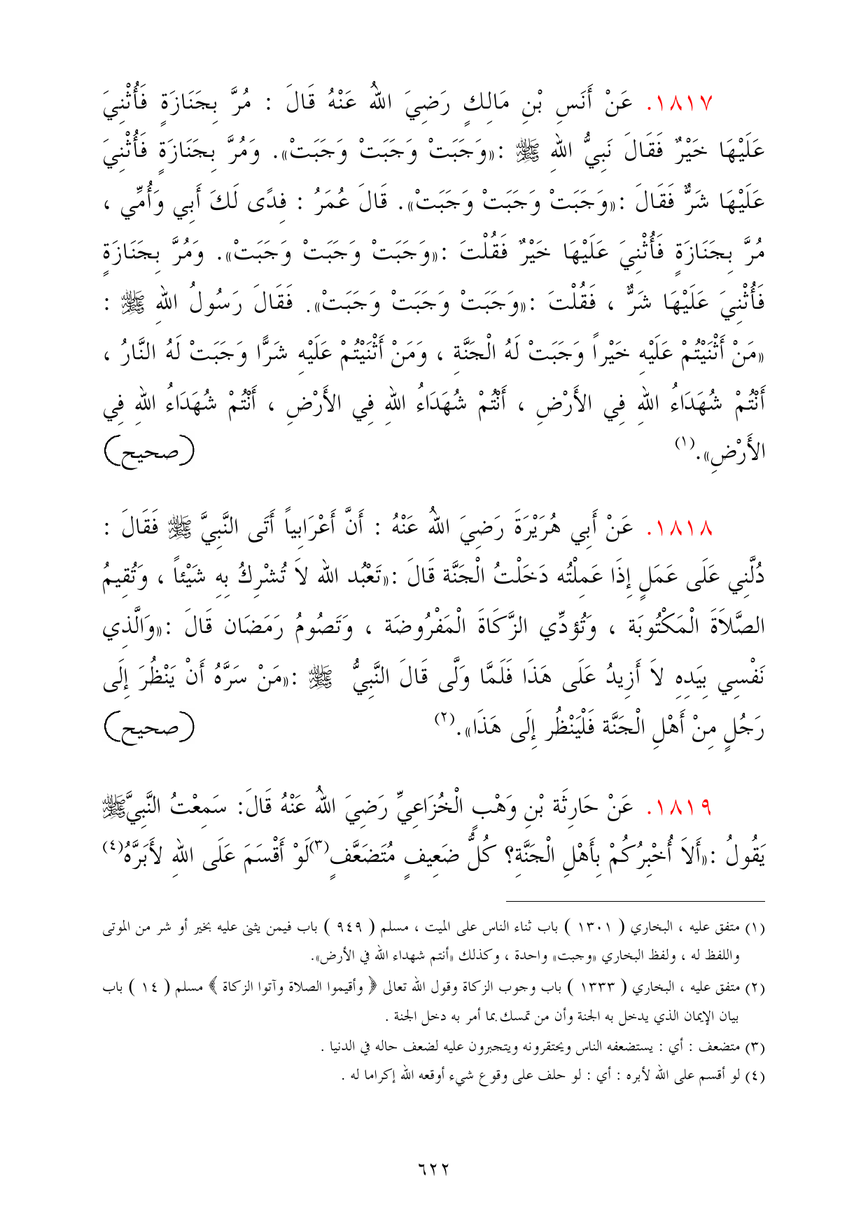 1818 - عَنْ أَبِي هُرَيْرَةَ رَضِيَ اللهُ عَنْهُ: أَنَّ أَعْرَابِياً أَتَى النَّبِيَّ - صلى الله عليه وسلم - فَقَالَ: دُلَّنِي عَلَى عَمَلٍ إِذَا عَمِلْتُه دَخَلْتُ الْجَنَّة قَالَ: «تَعْبُد الله لاَ تُشْرِكُ بِهِ شَيْئاً، وَتُقِيمُ الصَّلاَةَ الْمَكْتُوبَة، وَتُؤدِّي الزَّكَاةَ الْمَفْرُوضَة، وَتَصُومُ رَمَضَان قَالَ: «وَالَّذِي نَفْسِي بِيَدِهِ لاَ أَزِيدُ عَلَى هَذَا فَلَمَّا وَلَّى قَالَ النَّبِيُّ - صلى الله عليه وسلم -: «مَنْ سَرَّهُ أَنْ يَنْظُرَ إِلَى رَجُلٍ مِنْ أَهْلِ الْجَنَّة فَلْيَنْظُر إِلَى هَذَا». (¬2) =صحيح