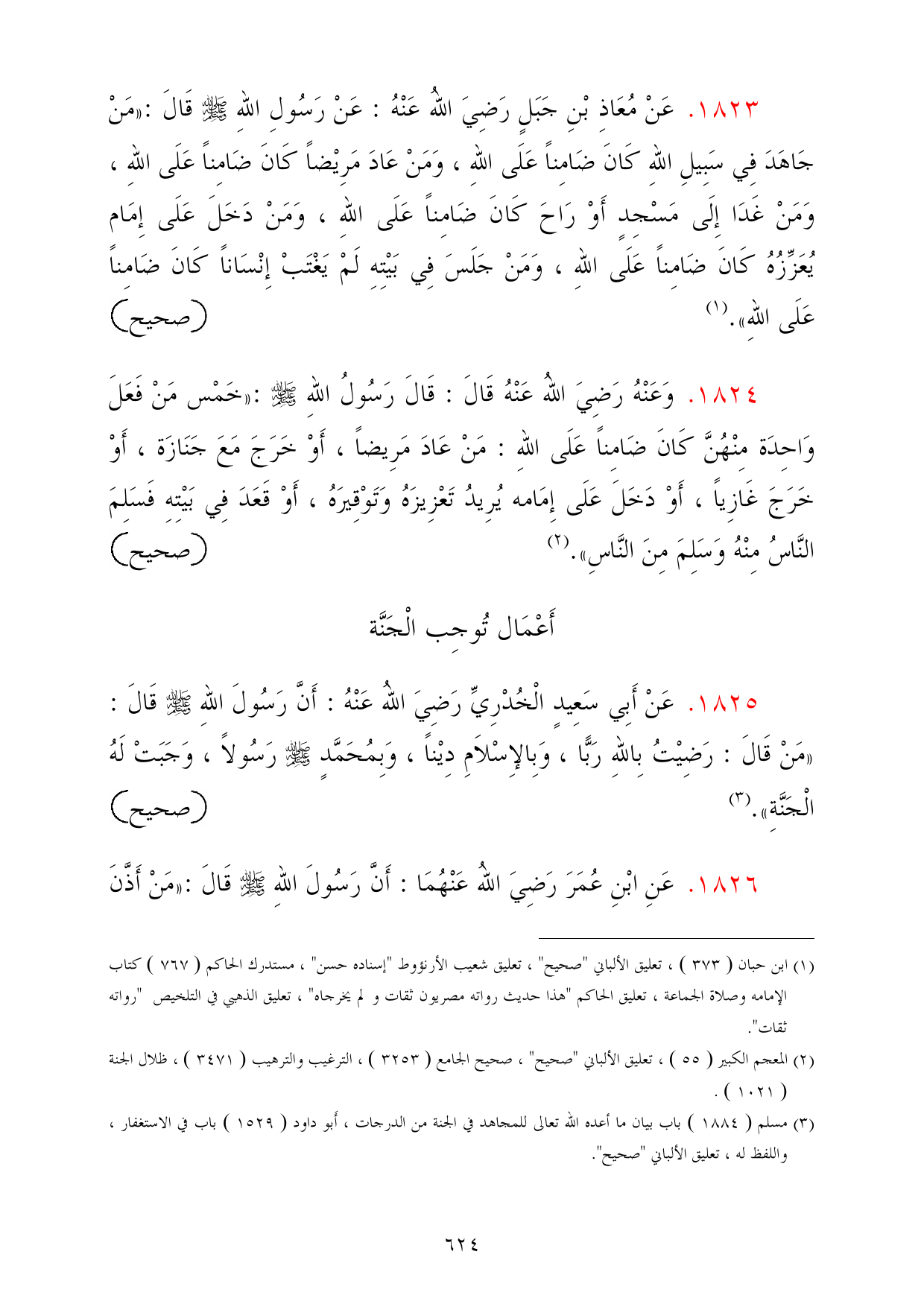 1825 - عَنْ أَبِي سَعِيدٍ الْخُدْرِيِّ رَضِيَ اللهُ عَنْهُ: أَنَّ رَسُولَ اللهِ - صلى الله عليه وسلم - قَالَ: «مَنْ قَالَ: رَضِيْتُ بِاللهِ رَبًّا، وَبِالإِسْلاَمِ دِيْناً، وَبِمُحَمَّدٍ - صلى الله عليه وسلم - رَسُولاً، وَجَبَتْ لَهُ الْجَنَّةِ». (¬3) =صحيح