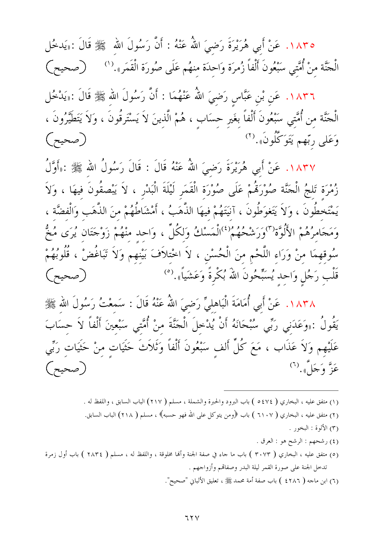1838 - عَنْ أَبِي أُمَامَةَ الْبَاهِلِيِّ رَضِيَ اللهُ عَنْهُ قَالَ: سَمِعْتُ رَسُولَ اللهِ - صلى الله عليه وسلم - يَقُولُ: «وَعَدَنِي رَبِّي سُبْحَانَهُ أَنْ يُدْخِلَ الْجَنَّةَ مِنْ أُمَّتِي سَبْعِينَ أَلْفاً لاَ حِسَابَ عَلَيْهِم وَلاَ عَذَاب، مَعَ كُلِّ أَلفٍ سَبْعُونَ أَلْفاً وَثَلاَثَ حَثَيَاتٍ مِنْ حَثَيَاتِ رَبِّي عَزَّ وَجَلَّ». (¬6) =صحيح