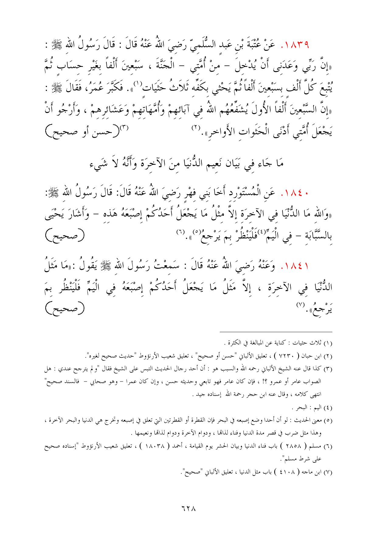 1841 - وَعَنْهُ رَضِيَ اللهُ عَنْهُ قَالَ: سَمِعْتُ رَسُولَ اللهِ - صلى الله عليه وسلم - يَقُولُ: «مَا مَثَلُ الدُّنْيَا فِي الآخِرَةِ، إِلاَّ مَثَلُ مَا يَجْعَلُ أَحَدُكُمْ إِصْبَعَهُ فِي الْيَمِّ فَلْيَنْظُر بِمَ يَرْجِعُ». (¬7) =صحيح
