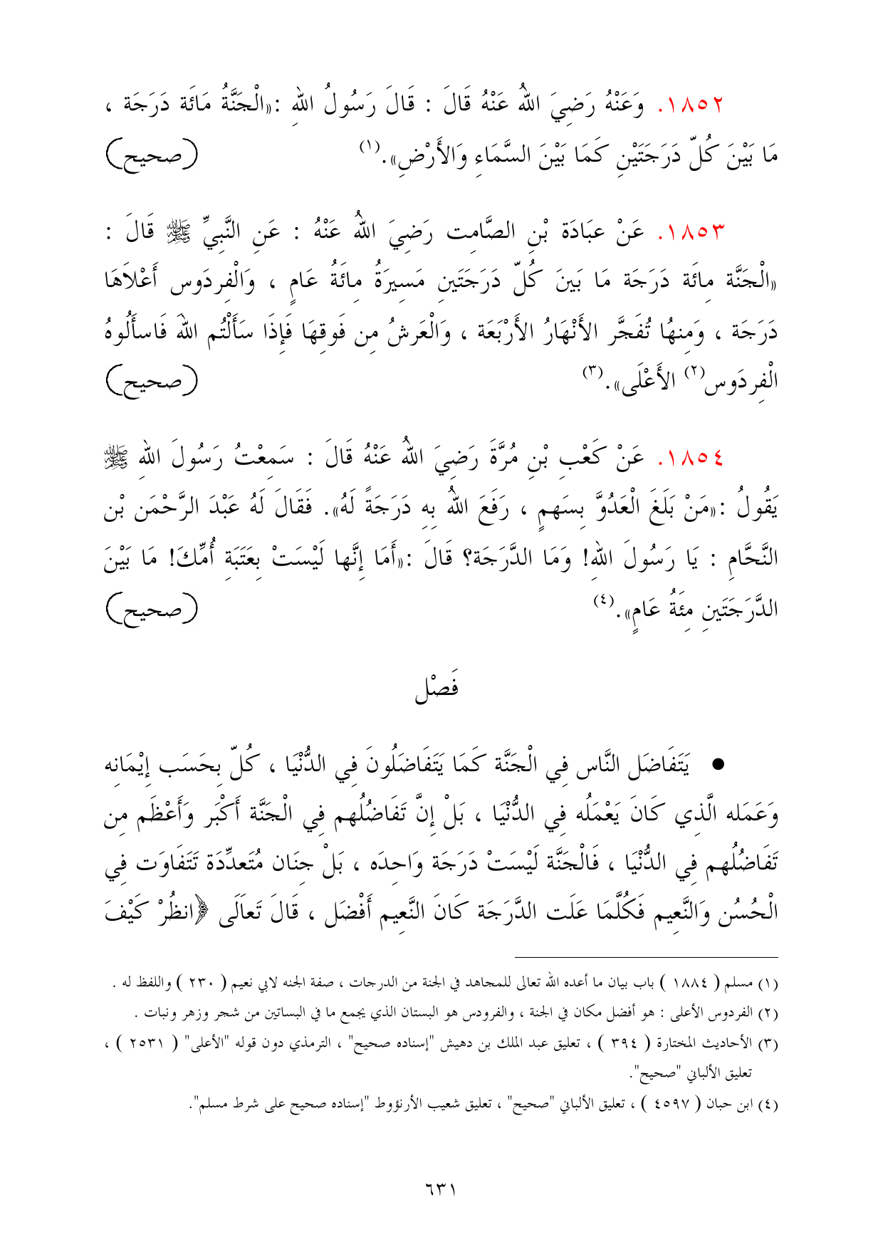 1853 - عَنْ عبَادَة بْنِ الصَّامِت رَضِيَ اللهُ عَنْهُ: عَنِ النَّبِيِّ - صلى الله عليه وسلم - قَالَ: «الْجَنَّة مِائَة دَرَجَة مَا بَينَ كُلّ دَرَجَتَينِ مَسِيرَةُ مِائَةُ عَامٍ، وَالْفِردَوس أَعْلاَهَا دَرَجَة، وَمِنهُا تُفَجَّر الأَنْهَارُ الأَرْبَعَة، وَالْعَرشُ مِن فَوقِهَا فَإِذَا سَأَلْتُم اللهَ فَاسأَلُوهُ الْفِردَوس (¬2) الأَعْلَى». (¬3) =صحيح