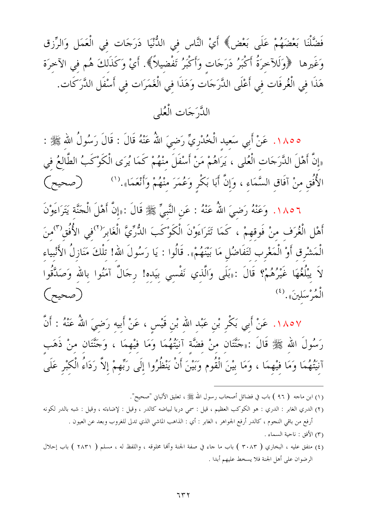 1857 - عَنْ أَبِي بَكْرِ بْنِ عَبْدِ اللهِ بْنِ قَيْسٍ، عَنْ أَبِيهِ رَضِيَ اللهُ عَنْهُ: أَنَّ رَسُولَ اللهِ - صلى الله عليه وسلم - قَالَ: «جَنَّتَانِ مِنْ فِضَّةٍ آنِيَتُهُمَا وَمَا فِيْهِمَا، وَجَنَّتَانِ مِنْ ذَهَبٍ آنِيَتُهُمَا وَمَا فِيْهِمَا، وَمَا بِيْنَ الْقُوم وَبَيْنَ أَنْ يَنْظُرُوا إِلَى رَبِّهِمْ إِلاَّ رَدَاءُ الْكِبْرِ عَلَى