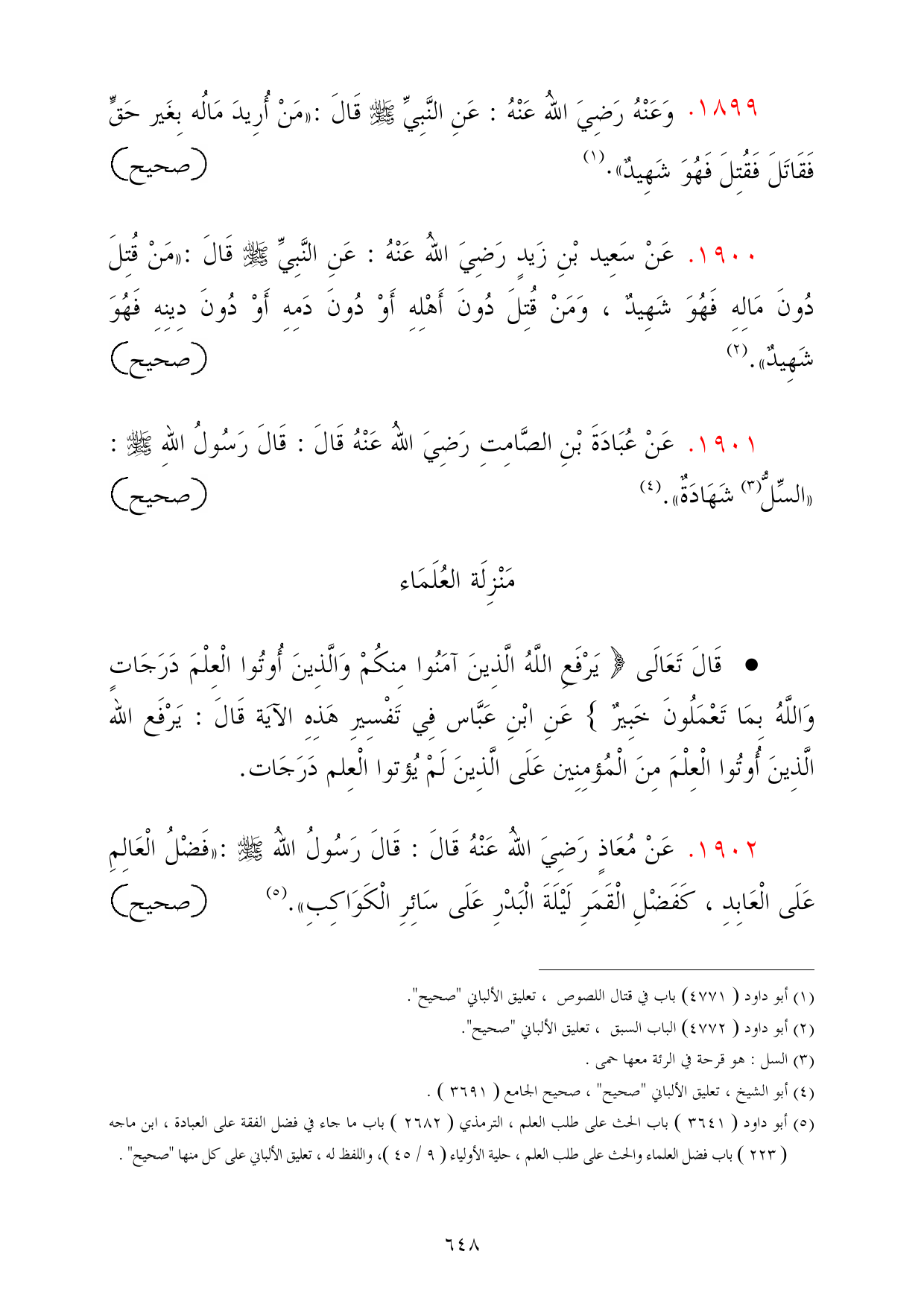 (¬5) أبو داود (3641) باب الحث على طلب العلم، الترمذي (2682) باب ما جاء في فضل الفقة على العبادة، ابن ماجه (223) باب فضل العلماء والحث على طلب العلم، حلية الأولياء (9/ 45)، واللفظ له، تعليق الألباني على كل منها "صحيح".