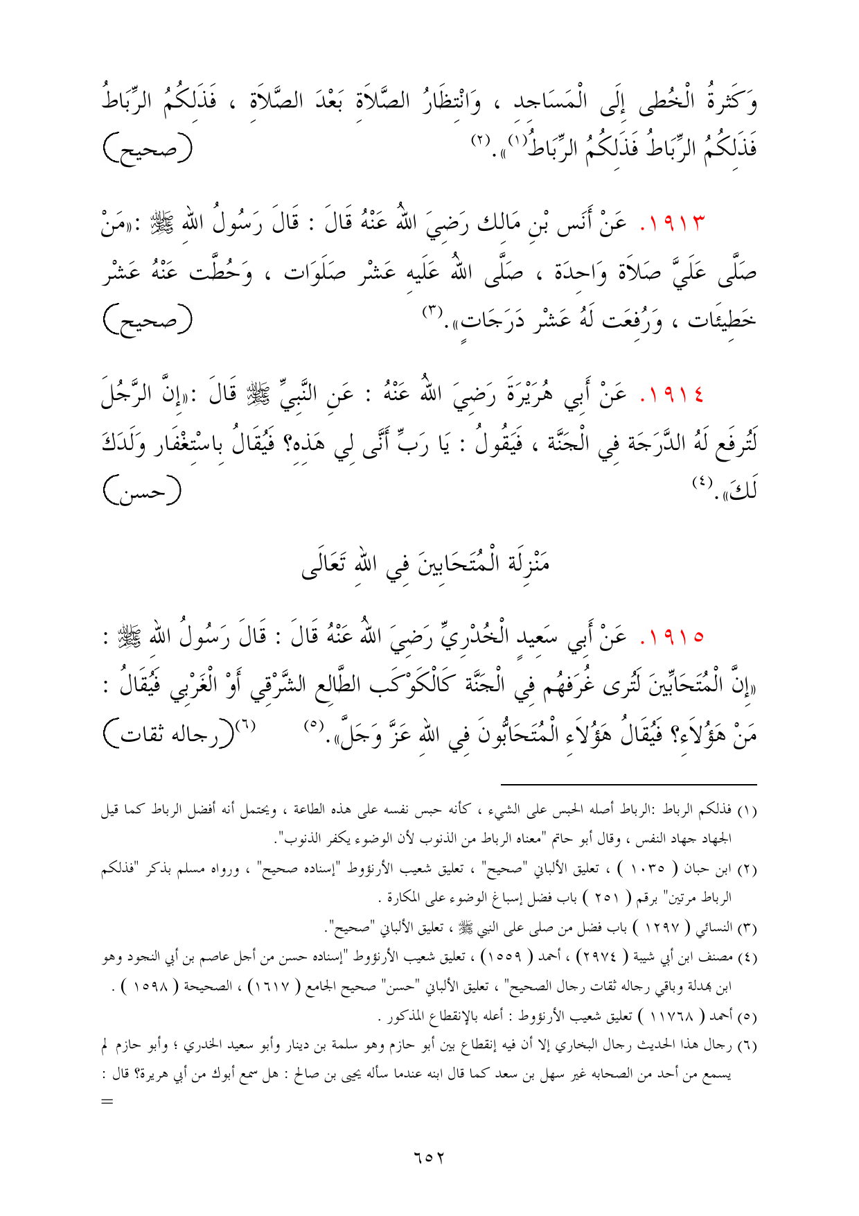 1915 - عَنْ أَبِي سَعِيدٍ الْخُدْرِيِّ رَضِيَ اللهُ عَنْهُ قَالَ: قَالَ رَسُولُ اللهِ - صلى الله عليه وسلم -: «إِنَّ الْمُتَحَابِّينَ لَتُرى غُرَفهُم فِي الْجَنَّة كَالْكَوْكَب الطَّالِع الشَّرْقِي أَوْ الْغَرْبِي فَيُقَالُ: مَنْ هَؤُلاَءِ؟ فَيُقَالُ هَؤُلاَءِ الْمُتَحَابُّونَ فِي اللهِ عَزَّ وَجَلَّ». (¬5) ... (¬6) *رجاله ثقات