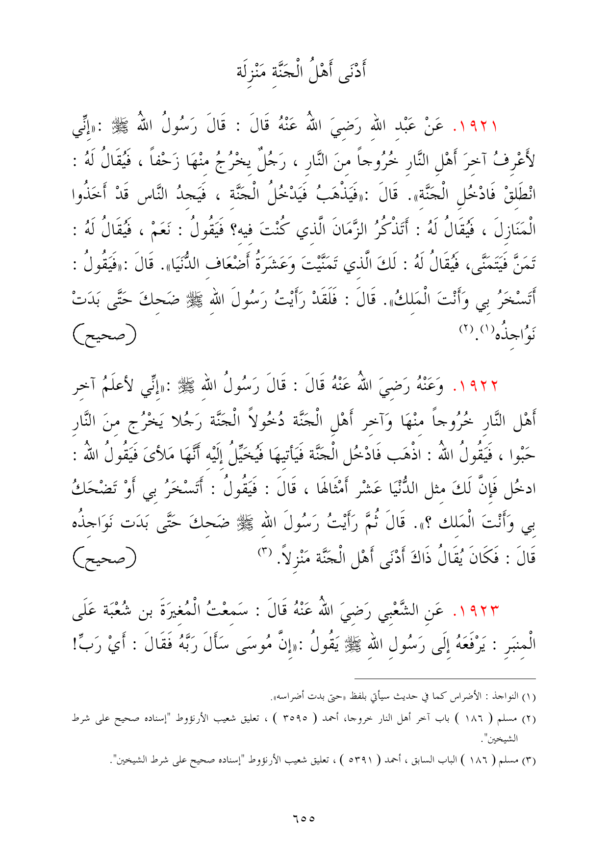 (¬2) مسلم (186) باب آخر أهل النار خروجا، أحمد (3595)، تعليق شعيب الأرنؤوط "إسناده صحيح على شرط الشيخين".