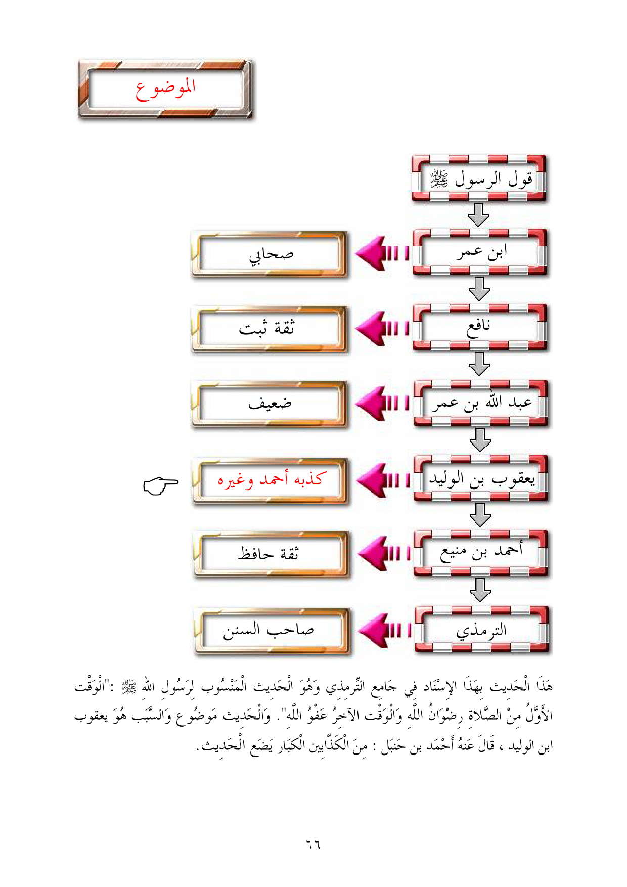 هَذَا الْحَدِيث بِهَذَا الإِسْنَاد فِي جَامِع التِّرمِذِي وَهُوَ الْحَدِيث الْمَنْسُوب لِرَسُولِ اللهِ - صلى الله عليه وسلم -:"الْوَقْت الأَوَّلُ مِنْ الصَّلاةِ رِضْوَانُ اللَّهِ وَالْوَقْت الآخِرُ عَفْوُ اللَّهِ". وَالْحَدِيث مَوضُوع وَالسَّبَب هُوَ يعقوب ابن الوليد، قَالَ عَنهُ أَحْمَد بن حَنبَل: مِنَ الْكَذَّابِين الْكبَار يَضَع الْحَدِيث.