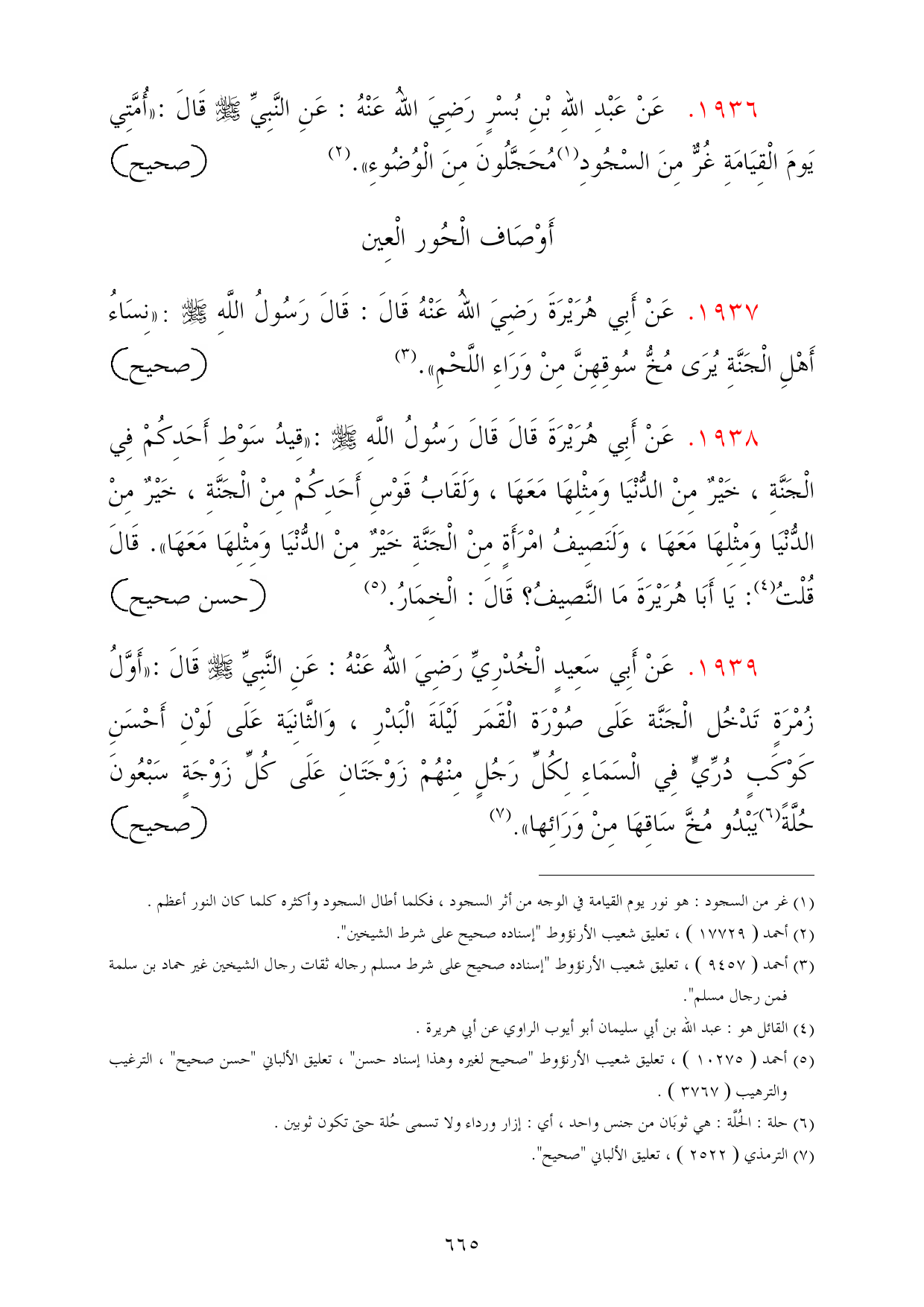 1939 - عَنْ أَبِي سَعِيدٍ الْخُدْرِيِّ رَضِيَ اللهُ عَنْهُ: عَنِ النَّبِيِّ - صلى الله عليه وسلم - قَالَ: «أَوَّلُ زُمْرَةٍ تَدْخُل الْجَنَّة عَلَى صُوْرَة الْقَمَر لَيْلَةَ الْبَدْرِ، وَالثَّانِيَة عَلَى لَوْنِ أَحْسَنِ كَوْكَبٍ دُرِّيٍّ فِي الْسَمَاءِ لِكُلِّ رَجُلٍ مِنْهُمْ زَوْجَتَانِ عَلَى كُلِّ زَوْجَةٍ سَبْعُونَ حُلَّةً (¬6) يَبْدُو مُخَّ سَاقِهَا مِنْ وَرَائِها». (¬7) =صحيح