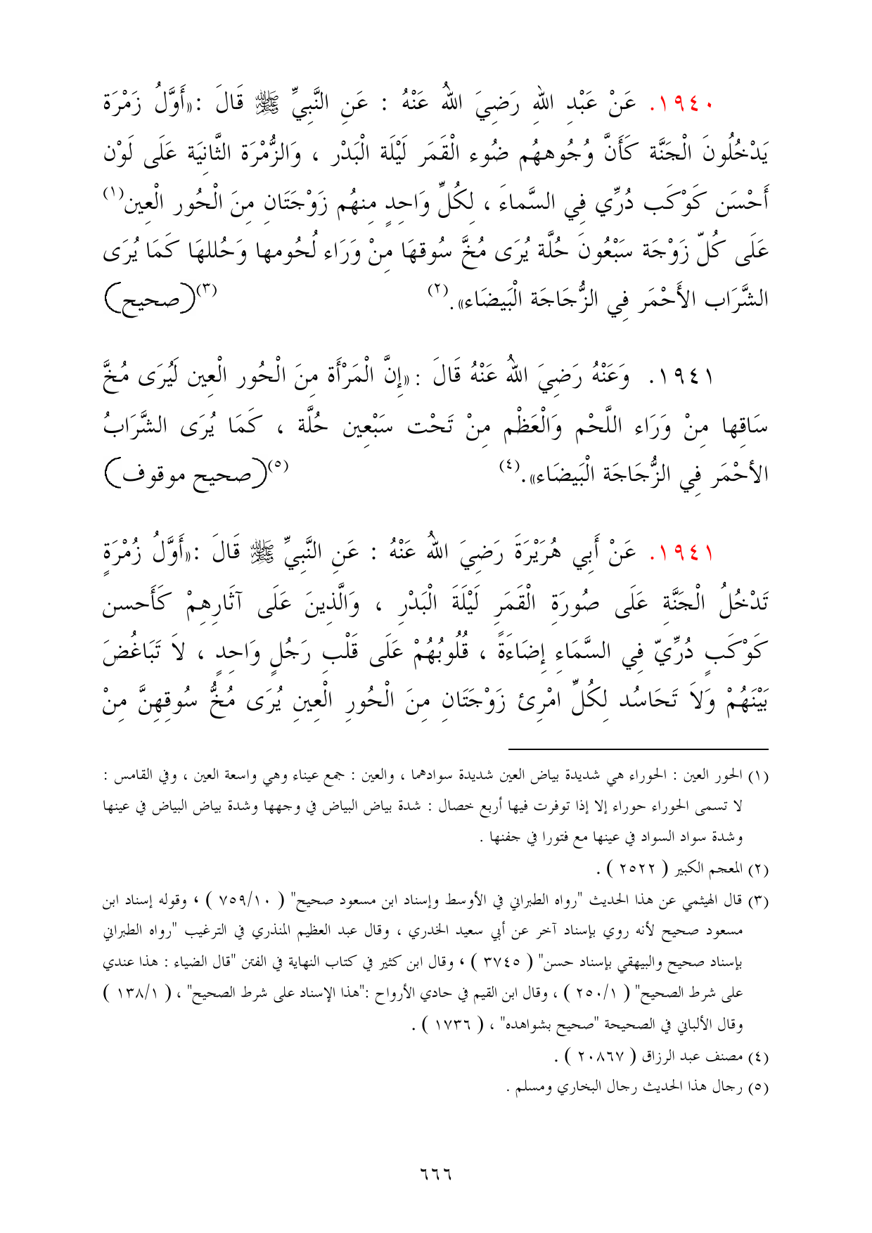 1941 - عَنْ أَبِي هُرَيْرَةَ رَضِيَ اللهُ عَنْهُ: عَنِ النَّبِيِّ - صلى الله عليه وسلم - قَالَ: «أَوَّلُ زُمْرَةٍ تَدْخُلُ الْجَنَّةِ عَلَى صُورَةِ الْقَمَرِ لَيْلَةَ الْبَدْرِ، وَالَّذِينَ عَلَى آثَارِهِمْ كَأَحسن كَوْكَبٍ دُرِّيّ فِي السَّمَاءِ إِضَاءَةً، قُلُوبُهُمْ عَلَى قَلْبِ رَجُلٍ وَاحِدٍ، لاَ تَبَاغُضَ بَيْنَهُمْ وَلاَ تَحَاسُد لِكُلِّ امْرِئ زَوْجَتَانِ مِنَ الْحُورِ الْعِينِ يُرَى مُخُّ سُوقِهِنَّ مِنْ
