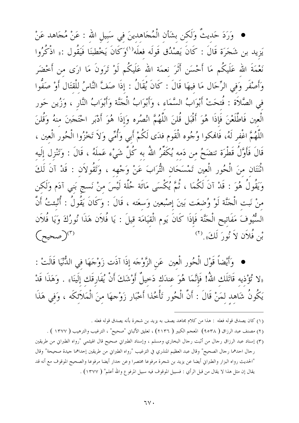 * وَرَدَ حَدِيثٌ وَلَكِن بِشَأنِ الْمُجَاهِدِينَ فِي سَبِيلِ اللهِ: عَنْ مُجَاهد عَنْ يَزِيد بن شَجَرَة قَالَ: كَانَ يَصْدُق قَولَه فِعلَه (¬1) وَكَانَ يَخْطبنَا فَيَقُول: «اذْكُرُوا نَعْمَةَ اللهِ عَلَيكُم مَا أَحْسَن أَثَرَ نِعمَة اللهِ عَلَيكُم لَوْ تَرَونَ مَا ارَى مِن أَخْضَر وَأَصْفَر وَفِي الرِّحَال مَا فِيهَا قَالَ: كَانَ يُقَالُ: إِذَا صَفَّ النَّاسُ لِلْقِتَال أَوْ صَفُّوا فِي الصَّلاَة: فُتِحَتْ أَبْوَابُ السَّمَاءِ، وَأَبْوَابُ الْجَنَّة وَأَبْوَابُ النَّارِ، وَزُين حَور الْعِين فَاطَّلَعْنَ فَإِذَا هُوَ أَقْبَل قُلنَ اللَّهُمَّ انْصُره وَإِذَا هُوَ أَدْبَر احْتَجَبنَ مِنهُ وَقُلنَ اللَّهُمَّ اغْفِر لَهُ، فَانهكوا وُجُوه الْقَوم فدَى لَكُمْ أَبِي وَأُمِّي وَلاَ تَخْزُوا الْحُور الْعِين، قَالَ فَأَوَّلُ قَطْرَة تنضَحُ مِن دَمِهِ يُكَفِّرُ اللهُ بِهِ كُلَّ شَيْء عَمِلَهُ، قَالَ: وَتَنْزِل إِلَيهِ اثْنَتَانِ مِنَ الْحُور الْعِين تَمْسَحَانِ التُّرَابَ عَنْ وَجْهِهِ، وَتَقُولاَنِ: قَدْ آنَ لَكَ وَيَقُولُ هُوَ: قَدْ آنَ لَكُمَا، ثُمَّ يُكْسَى مَائَة حُلَّة لَيْسَ مِنْ نَسجِ بَنِي آدَم وَلَكِن مِنْ نَبتِ الْجَنَّة لَوْ وُضِعَت بَينَ إِصْبعين وَسِعَته، قَالَ: وَكَانَ يَقُولُ: أُنْبِئتُ أَنَّ السُّيُوفَ مَفَاتِيح الْجَنَّة فَإِذَا كَانَ يَوم الْقِيَامَة قِيلَ: يَا فُلاَن هَذَا نُورُكَ وَيَا فُلاَن بْن فُلاَن لاَ نُورَ لَكَ». (¬2) ... (¬3) *صحيح