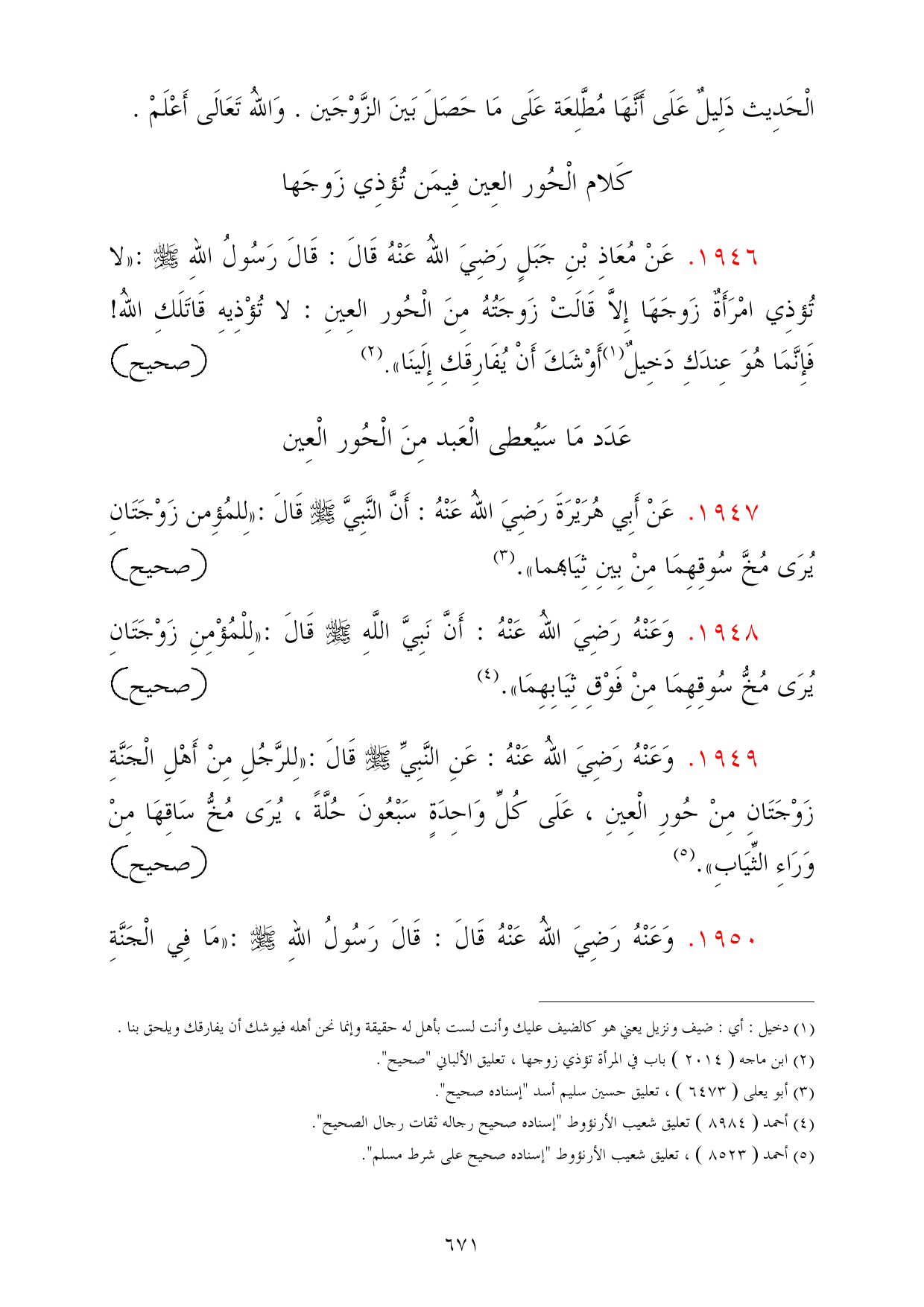 1947 - عَنْ أَبِي هُرَيْرَةَ رَضِيَ اللهُ عَنْهُ: أَنَّ النَّبِيَّ - صلى الله عليه وسلم - قَالَ: «لِلمُؤِمن زَوْجَتَانِ يُرَى مُخَّ سُوقِهِمَا مِنْ بِينِ ثِيَابهما». (¬3) =صحيح