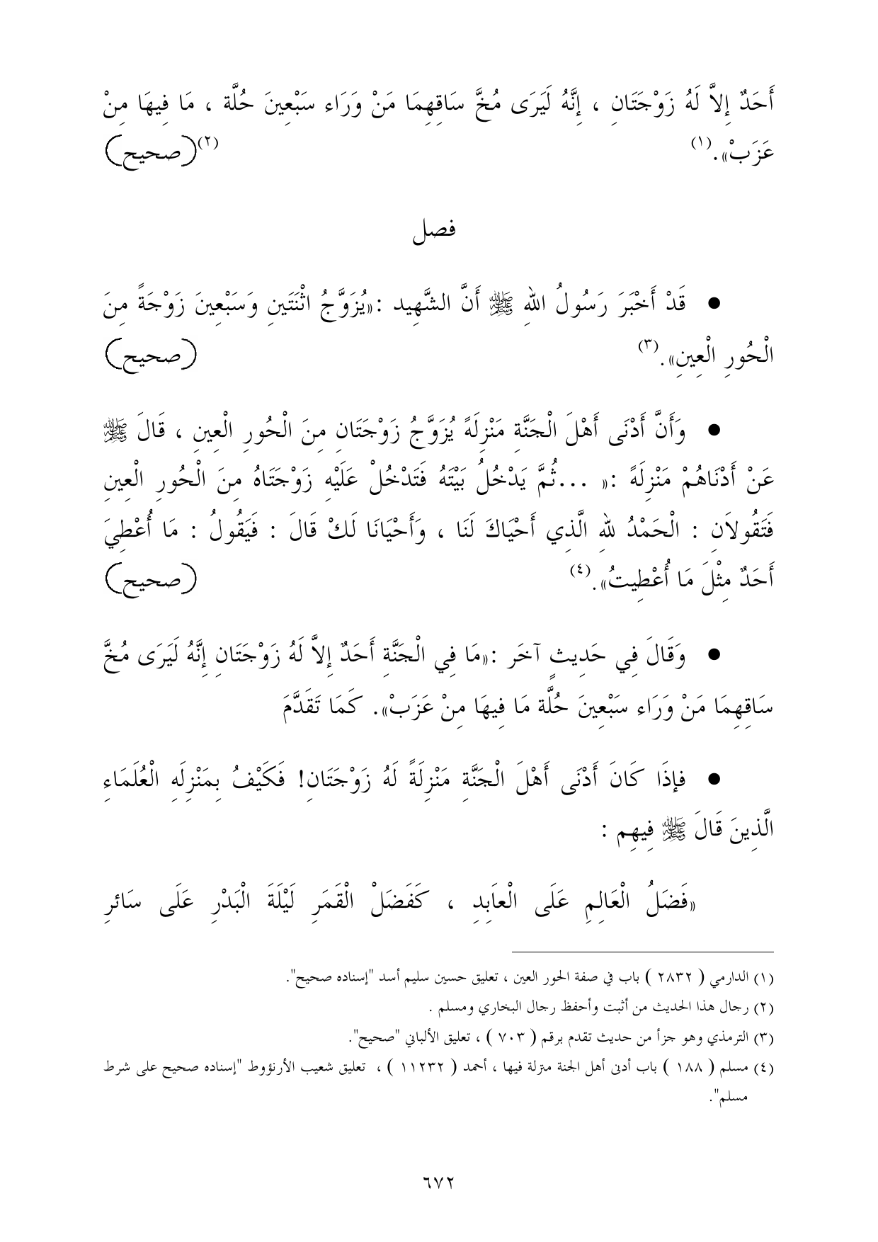 * فإذَا كَانَ أَدْنَى أَهْلَ الْجَنَّةِ مَنْزِلَةً لَهُ زَوْجَتَانِ! فَكَيْفُ بِمَنْزِلَهِ الْعُلَمَاءِ الَّذِينَ قَالَ - صلى الله عليه وسلم - فِيهِم: