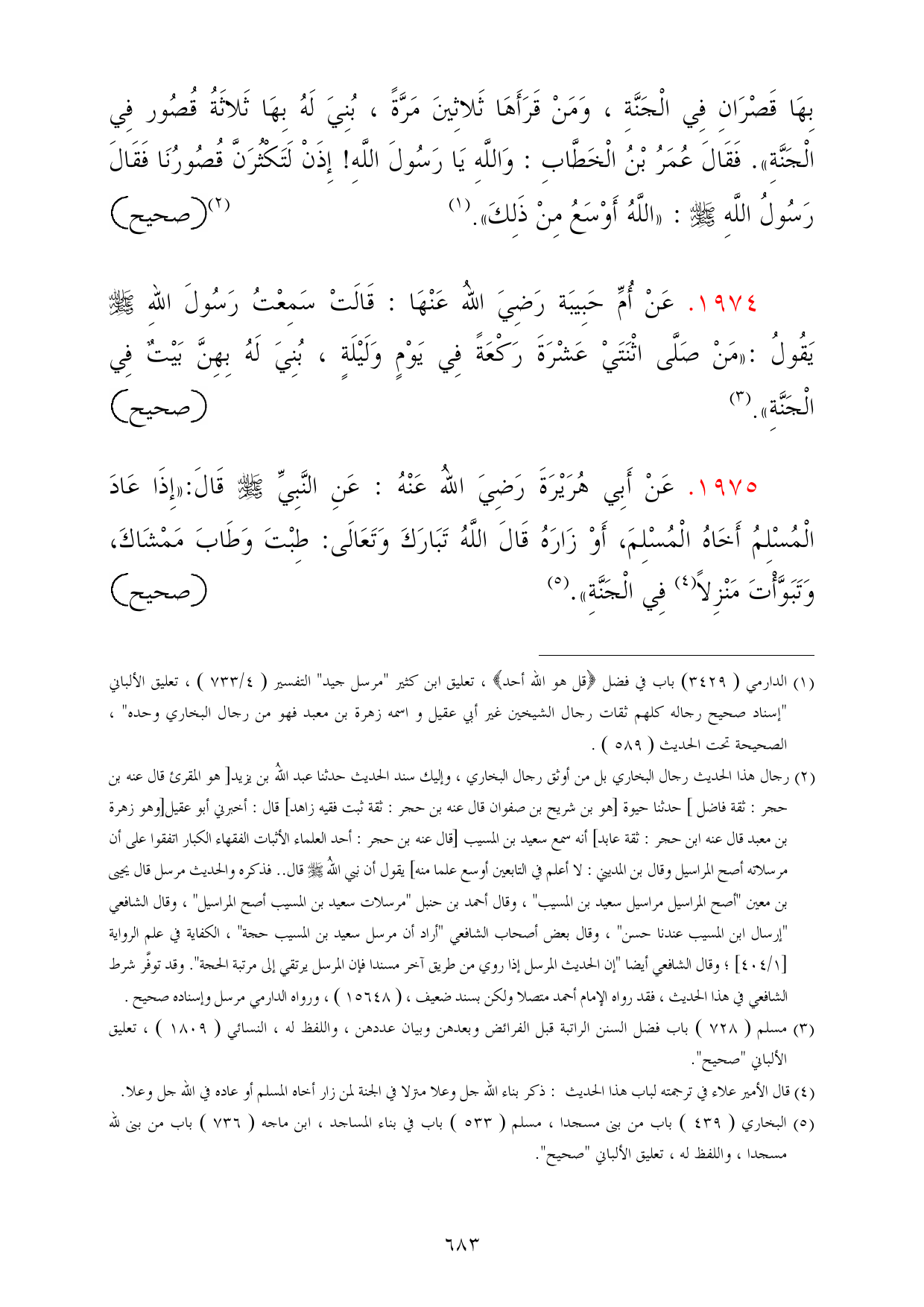 1975 - عَنْ أَبِي هُرَيْرَةَ رَضِيَ اللهُ عَنْهُ: عَنِ النَّبِيِّ - صلى الله عليه وسلم - قَالَ: «إِذَا عَادَ الْمُسْلِمُ أَخَاهُ الْمُسْلِمَ، أَوْ زَارَهُ قَالَ اللَّهُ تَبَارَكَ وَتَعَالَى: طِبْتَ وَطَابَ مَمْشَاكَ، وَتَبَوَّأْتَ مَنْزِلاً (¬4) فِي الْجَنَّةِ». (¬5) =صحيح