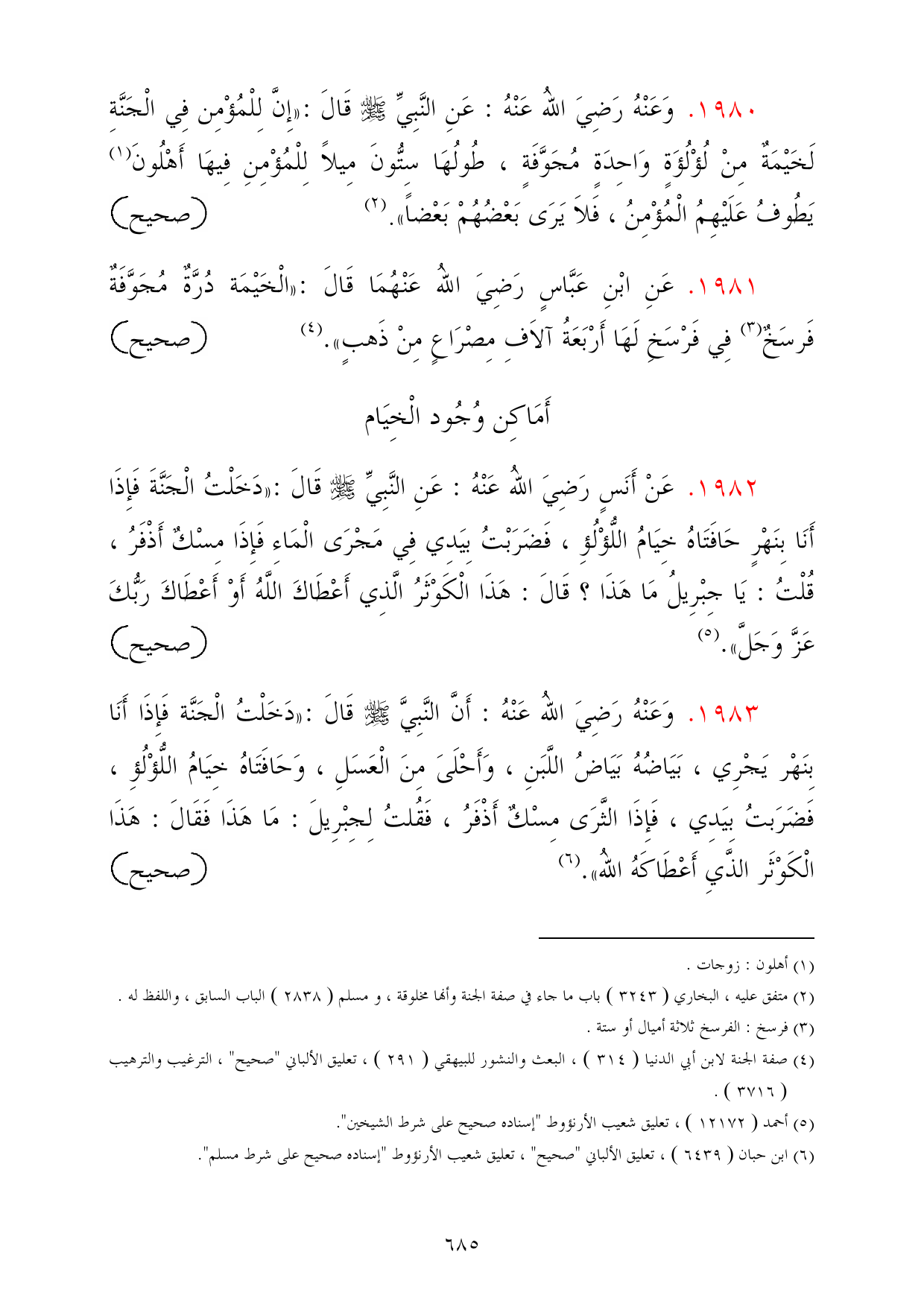 1981 - عَنِ ابْنِ عَبَّاسٍ رَضِيَ اللهُ عَنْهُمَا قَالَ: «الْخَيْمَة دُرَّةٌ مُجَوَّفَةٌ فَرسَخٌ (¬3) فِي فَرْسَخِ لَهَا أَرْبَعَةُ آلاَفِ مِصْرَاعٍ مِنْ ذَهبٍ». (¬4) =صحيح