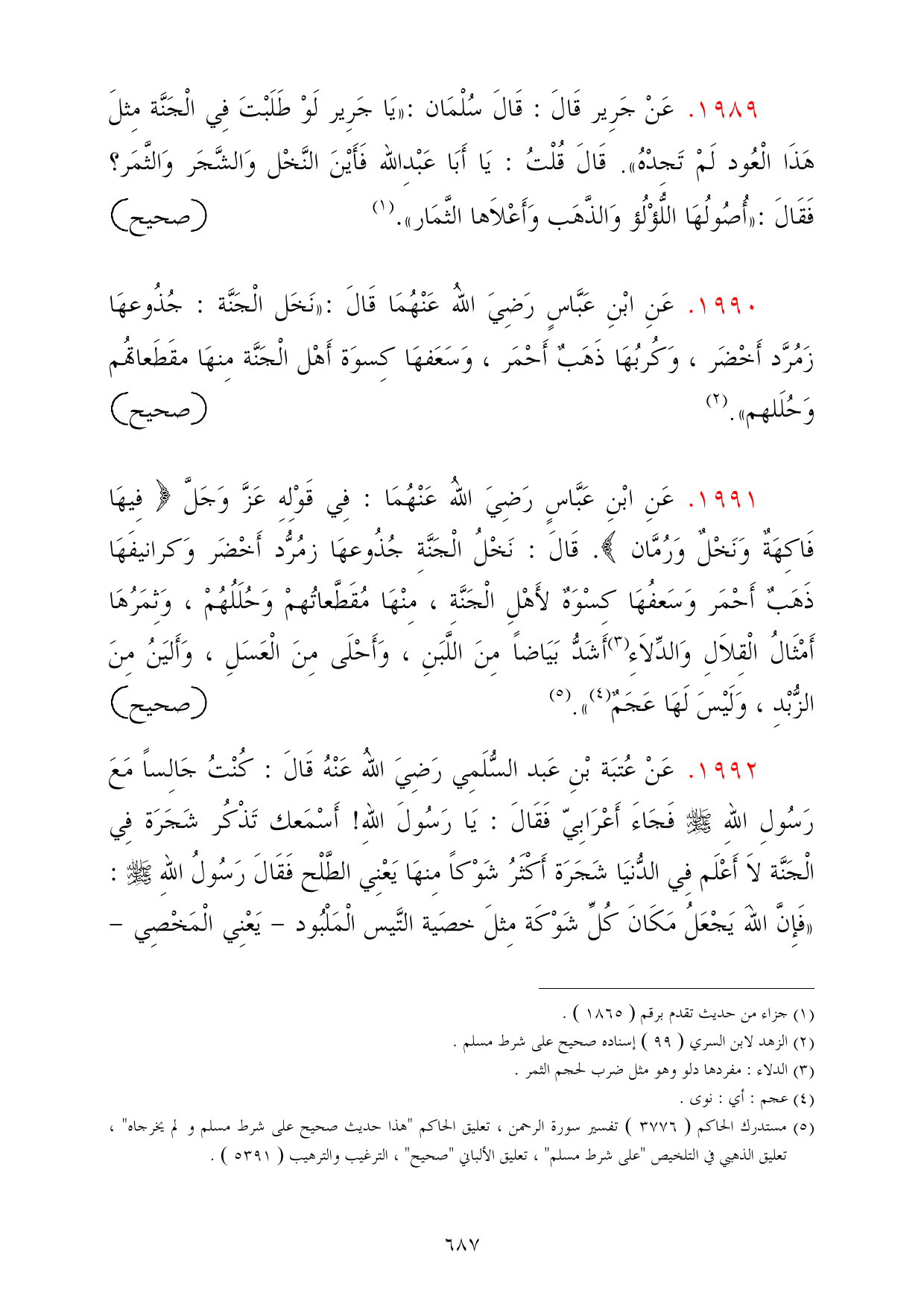 1992 - عَنْ عُتبَة بْنِ عَبد السُّلَمِي رَضِيَ اللهُ عَنْهُ قَالَ: كُنْتُ جَالِساً مَعَ رَسُولِ اللهِ - صلى الله عليه وسلم - فَجَاءَ أَعْرَابِيّ فَقَالَ: يَا رَسُولَ اللهِ! أَسْمَعك تَذْكُر شَجَرَة فِي الْجَنَّة لاَ أَعْلَم فِي الدُّنيَا شَجَرَة أَكْثَرُ شَوْكاً مِنهَا يَعْنِي الطَّلْح فَقَالَ رَسُولُ اللهِ - صلى الله عليه وسلم -: «فَإِنَّ اللهَ يَجْعَلُ مَكَانَ كُلِّ شَوْكَة مِثلَ خصَية التَّيس الْمَلْبُود - يَعْنِي الْمَخْصِي -