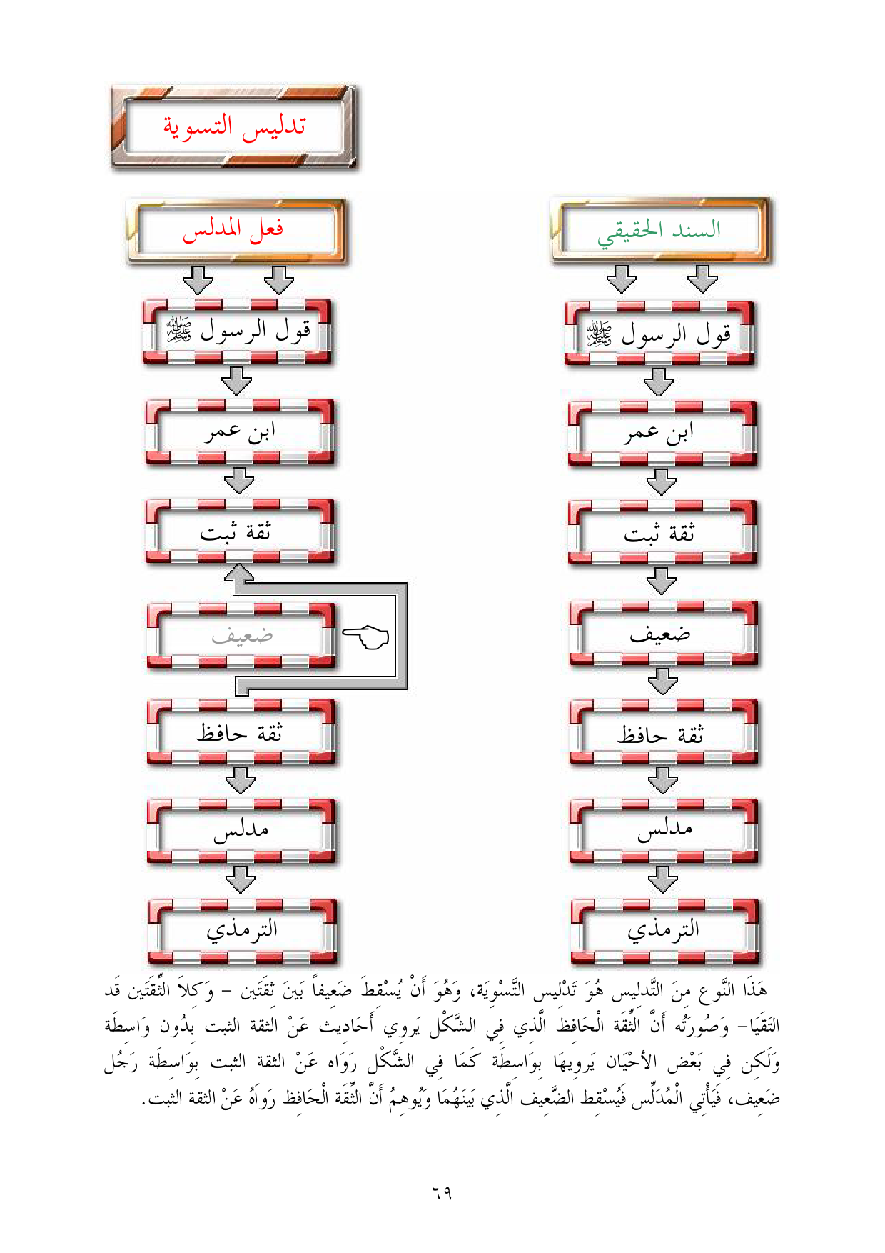 هَذَا النَّوع مِنَ التَّدلِيس هُوَ تَدْلِيس التَّسْوِيَة، وَهُوَ أَنْ يُسْقِطَ ضَعِيفاً بَينَ ثِقَتَين - وَكِلاَ الثِّقَتَين قَد التَقَيَا- وَصُورَتُه أَنَّ الثِّقَة الْحَافِظ الَّذِي فِي الشَّكْل يَروِي أَحَادِيث عَنْ الثقة الثبت بِدُون وَاسِطَة وَلَكِن فِي بَعْض الأحْيَان يَروِيهَا بِوَاسِطَة كَمَا فِي الشَّكْل رَوَاه عَنْ الثقة الثبت بِوَاسِطَة رَجُل ضَعِيف، فَيَأْتِي الْمُدَلِّس فَيُسْقِط الضَّعِيف الَّذِي بَينَهُمَا وَيُوهِمُ أَنَّ الثِّقَة الْحَافِظ رَواَهُ عَنْ الثقة الثبت.