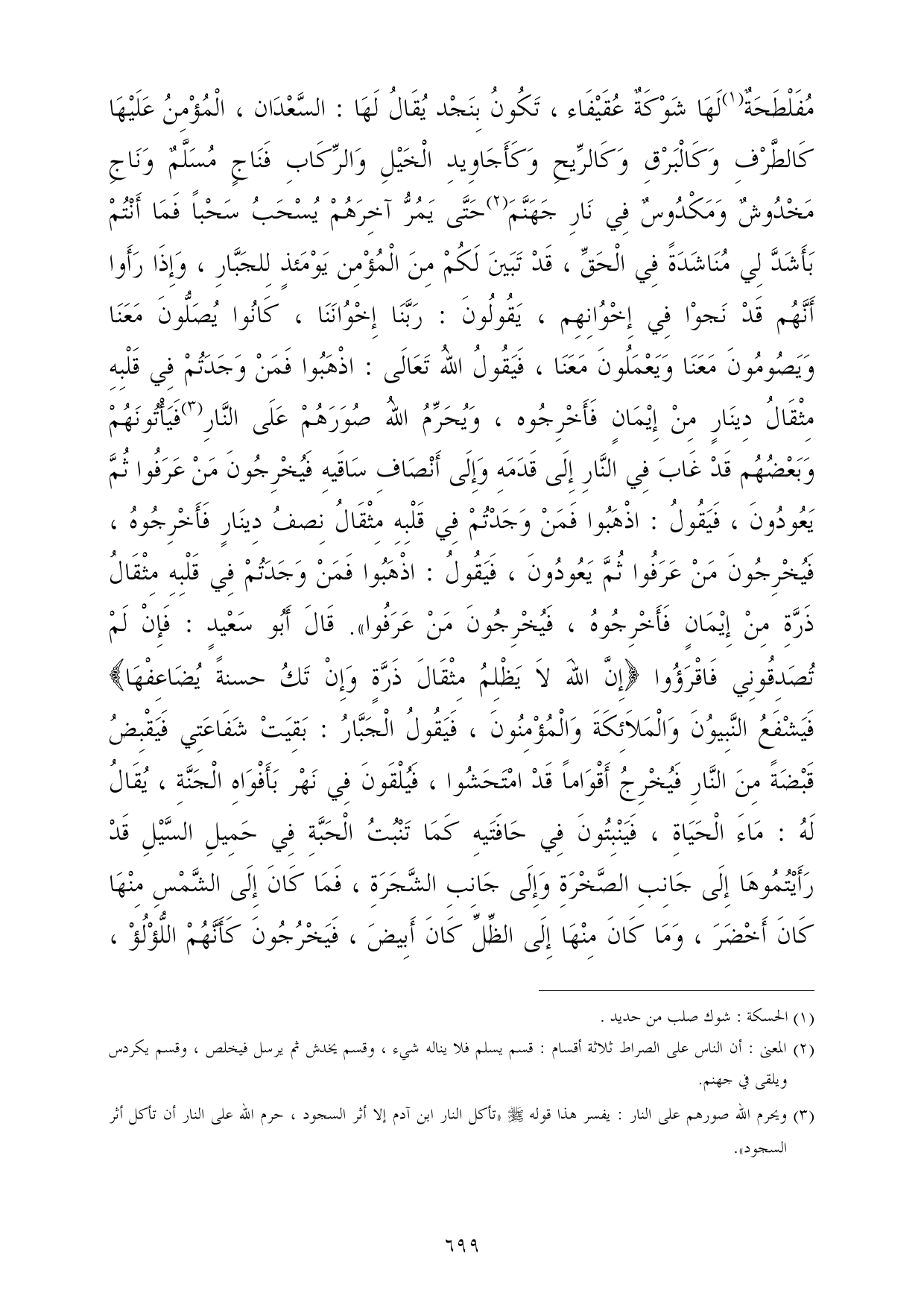 مُفَلْطَحَةٌ (¬1) لَهَا شَوْكَةٌ عُقَيْفَاء، تَكُونُ بِنَجْد يُقَالُ لَهَا: السَّعْدَان، الْمُؤْمِنُ عَلَيْهَا كَالطَّرْفِ وَكَالْبَرْقِ وَكَالرِّيحِ وَكَأَجَاوِيدِ الْخَيْلِ وَالرِّكَابِ فَنَاجٍ مُسَلَّمٌ وَنَاجِ مَخْدُوشٌ وَمَكْدُوسٌ فِي نَارِ جَهَنَّمَ (¬2) حَتَّى يَمُرُّ آخِرَهُمْ يُسْحَبُ سَحْباً فَمَا أَنْتُمْ بَأَشَدَّ لِي مُنَاشَدَةً فِي الْحَقِّ، قَدْ تَبَينَ لَكُمْ مِنَ الْمُؤْمِن يَوْمَئذٍ لِلجَبَّارِ، وَإِذَا رَأَوا أَنَّهُم قَدْ نَجوْا فِي إِخْوُانِهِم، يَقُولُونَ: رَبَّنَا إِخْوُانَنَا، كَانُوا يُصَلُّونَ مَعَنَا وَيَصُومُونَ مَعَنَا وَيَعْمَلُونَ مَعَنَا، فَيَقُولُ اللهُ تَعَالَى: اذْهَبُوا فَمَنْ وَجَدَتُمْ فِي قَلْبِهِ مِثْقَالُ دِينَارٍ مِنْ إِيْمَانٍ فَأَخْرِجُوه، وَيُحَرِّمُ اللهُ صُوَرَهُمْ عَلَى النَّارِ (¬3) فَيَأْتُونَهُمْ وَبَعْضُهُم قَدْ غَابَ فِي النَّارِ إِلَى قَدَمَهِ وَإِلَى أَنْصَافِ سَاقَيهِ فَيُخْرِجُونَ مَنْ عَرَفُوا ثُمَّ يَعُودُونَ، فَيَقُولُ: اذْهَبُوا فَمَنْ وَجَدْتُمْ فِي قَلْبِهِ مِثْقَالُ نِصفُ دِينَارٍ فَأَخْرِجُوهُ، فَيُخْرِجُونَ مَنْ عَرَفُوا ثُمَّ يَعُودُونَ، فَيَقُولُ: اذْهَبُوا فَمَنْ وَجَدَتُمْ فِي قَلْبِهِ مِثْقَالُ ذَرَّةِ مِنْ إِيْمَانٍ فَأَخْرِجُوهُ، فَيُخْرِجُونَ مَنْ عَرَفُوا». قَالَ أَبُو سَعْيدٍ: فَإِنْ لَمْ تُصَدِقُونِي فَاقْرَؤُوا {إِنَّ اللهَ لاَ يَظْلِمُ مِثْقَالَ ذَرَّةٍ وَإِنْ تَكُ حسنةً يُضَاعِفْهَا} فَيَشْفَعُ النَّبِيوُنَ وَالْمَلاَئِكَةَ وَالْمُؤْمِنُونَ، فَيَقُولُ الْجَبَّارُ: بَقِيَتْ شَفَاعَتِي فَيَقْبِضُ قَبْضَةً مِنَ النَّارِ فَيُخْرِجُ أَقْوَاماً قَدْ امْتَحَشُوا، فَيُلْقَونَ فِي نَهْر بَأَفْوَاهِ الْجَنَّةِ، يُقَالُ لَهُ: مَاءَ الْحَيَاةِ، فَيَنْبِتُونَ فِي حَافَتَيهِ كَمَا تَنْبُتُ الْحَبَّةِ فِي حَمِيلِ السَّيْلِ قَدْ رَأَيْتُمُوهَا إِلَى جَانِبِ الصَّخْرَةِ وَإِلَى جَانِبِ الشَّجَرَةِ، فَمَا كَانَ إِلَى الشَّمْسِ مِنْهَا كَانَ أَخْضَرَ، وَمَا كَانَ مِنْهَا إِلَى الظِّلِّ كَانَ أَبِيضَ، فَيَخْرُجُونَ كَأَنَّهُمْ اللُّؤْلُؤْ،
