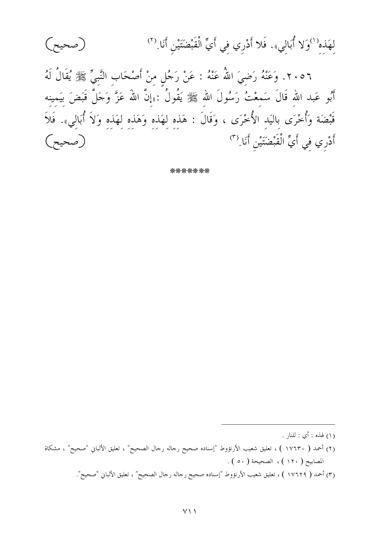2056 - وَعَنْهُ رَضِيَ اللهُ عَنْهُ: عَنْ رَجُلٍ مِنْ أَصْحَابِ النَّبِيِّ - صلى الله عليه وسلم - يُقَالُ لَهُ أَبُو عَبد اللهِ قَالَ سَمِعْتُ رَسُولَ اللهِ - صلى الله عليه وسلم - يَقُولُ: «إِنَّ اللهَ عَزَّ وَجَلَّ قَبَضَ بِيَمِينِه قَبْضَة وَأُخْرَى بِاليَدِ الأُخْرَى، وَقَالَ: هَذِهِ لِهَذِهِ وَهَذِهِ لِهَذِهِ وَلاَ أُبَالِي». فَلاَ أَدْرِي فِي أَيِّ الْقَبْضَتَيْنِ أَنَا. (¬3) =صحيح