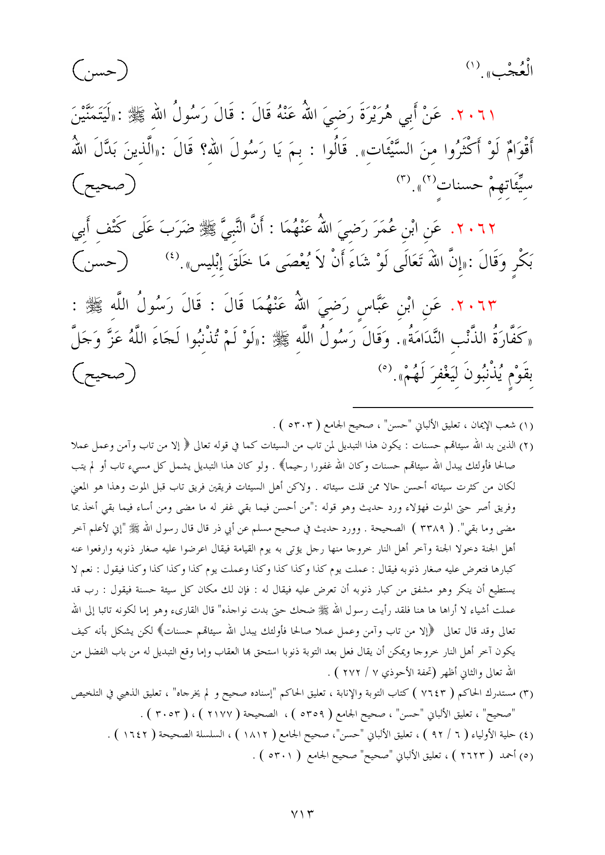 2061 - عَنْ أَبِي هُرَيْرَةَ رَضِيَ اللهُ عَنْهُ قَالَ: قَالَ رَسُولُ اللهِ - صلى الله عليه وسلم -: «لَيَتَمَنَّيْنَ أَقْوَامٌ لَوْ أَكْثَرُوا مِنَ السَّيْئَاتِ». قَالُوا: بِمَ يَا رَسُولَ اللهِ؟ قَالَ: «الَّذِينَ بَدَّلَ اللهُ سِيِّئَاتِهِمْ حسناتٍ (¬2)». (¬3) =صحيح