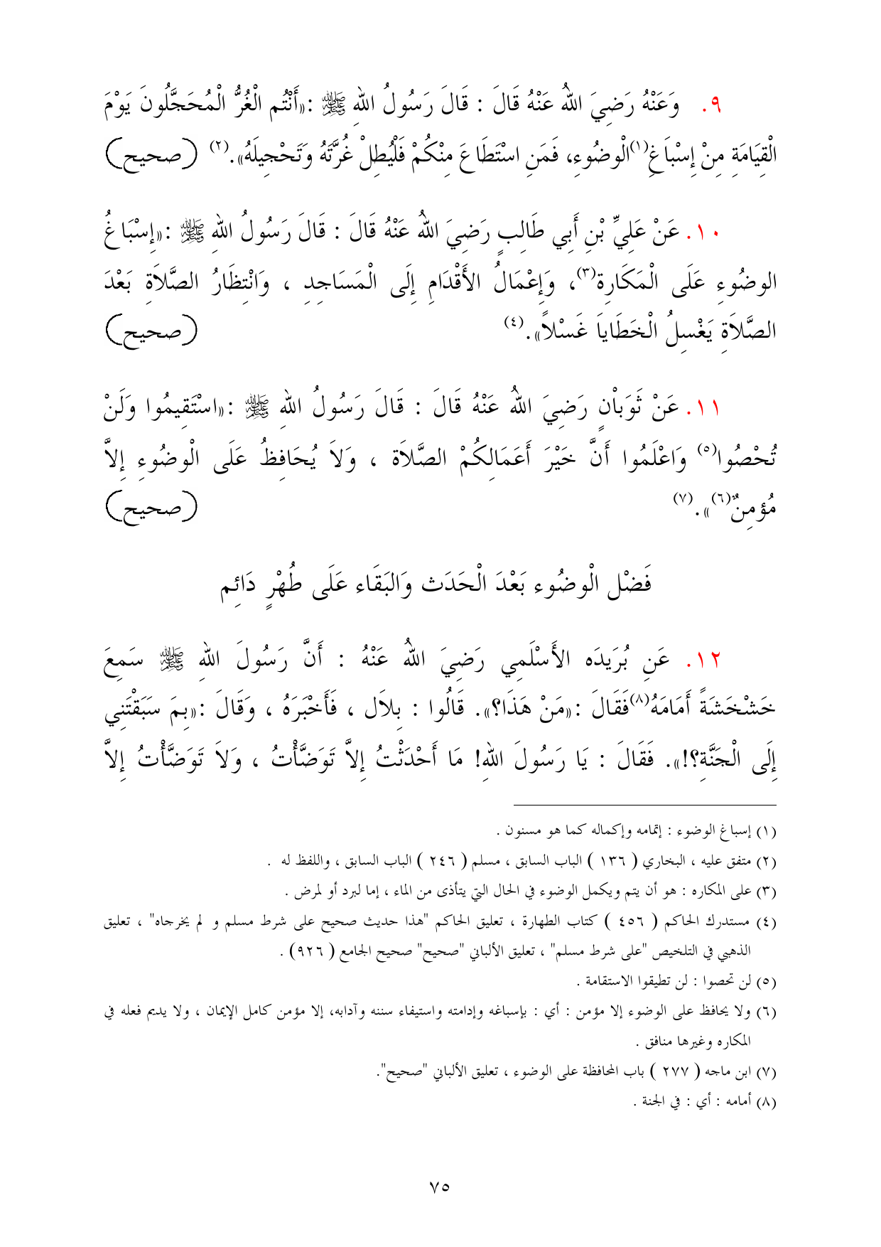 11 - عَنْ ثَوَباْنٍ رَضِيَ اللهُ عَنْهُ قَالَ: قَالَ رَسُولُ اللهِ - صلى الله عليه وسلم -: «اسْتَقِيمُوا وَلَنْ تُحْصُوا (¬5) وَاعْلَمُوا أَنَّ خَيْرَ أَعَمَالِكُمْ الصَّلاَة، وَلاَ يُحَافِظُ عَلَى الْوضُوءِ إِلاَّ مُؤمِنٌ (¬6)». (¬7) =صحيح