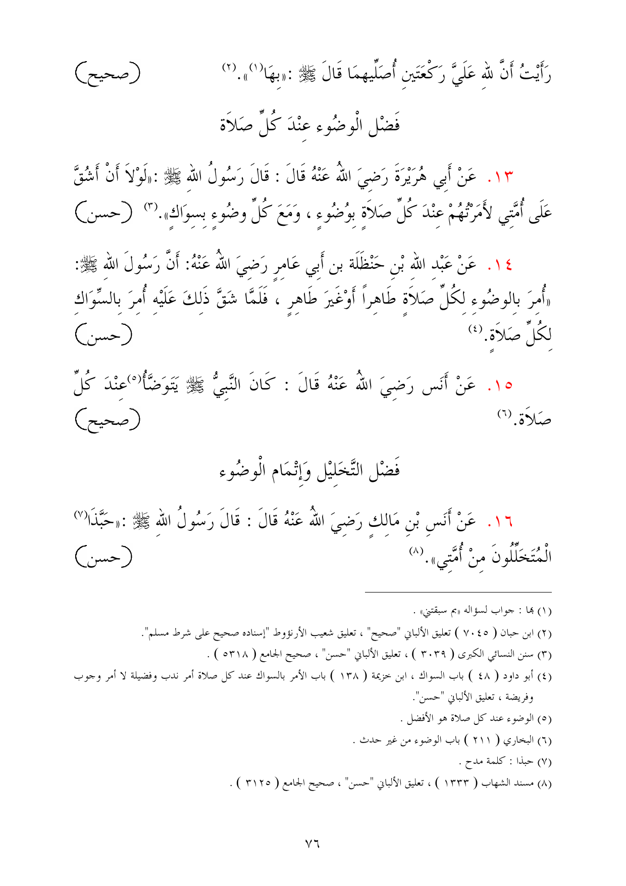 15 - عَنْ أَنَس رَضِيَ اللهُ عَنْهُ قَالَ: كَانَ النَّبِيُّ - صلى الله عليه وسلم - يَتَوَضَّأُ (¬5) عِنْدَ كُلِّ صَلاَة. (¬6) =صحيح