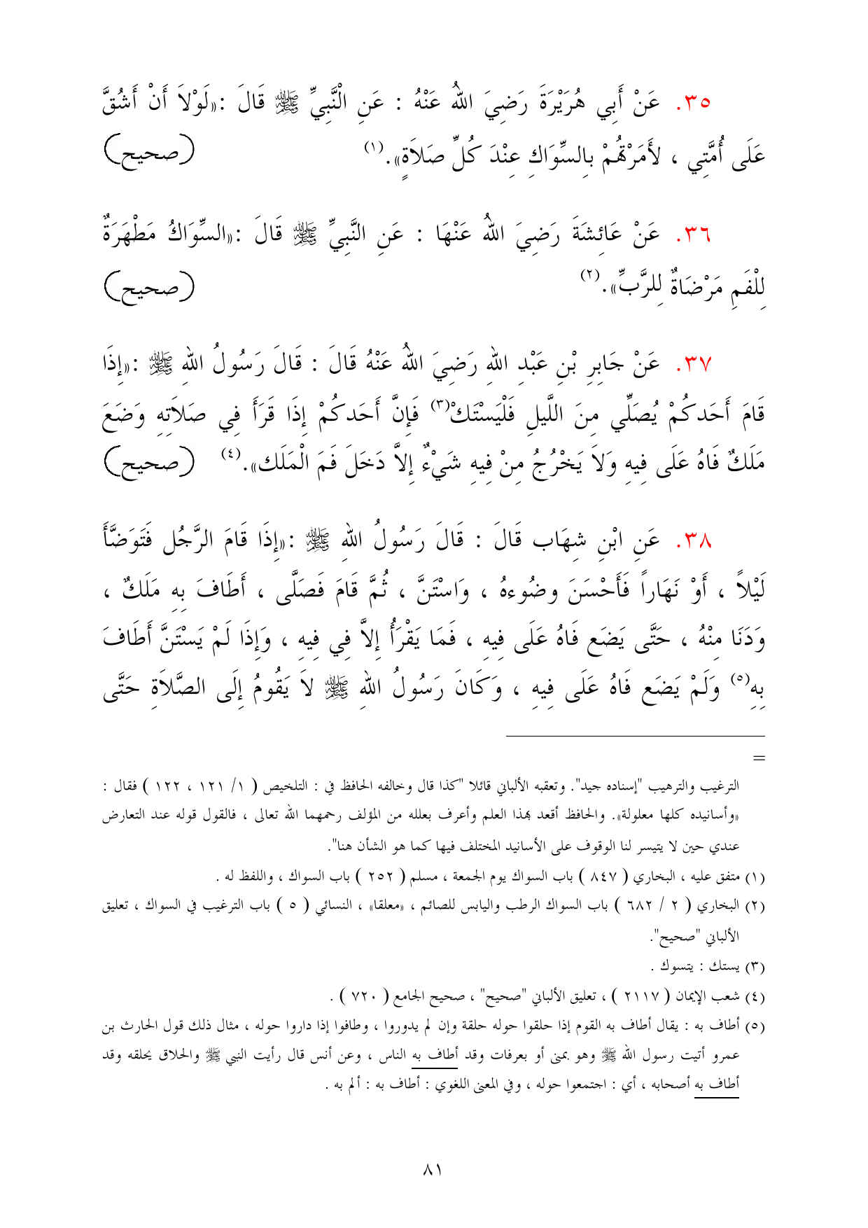 38 - عَنِ ابْنِ شِهَاب قَالَ: قَالَ رَسُولُ اللهِ - صلى الله عليه وسلم -: «إِذَا قَامَ الرَّجُل فَتَوَضَّأَ لَيْلاً، أَوْ نَهَاراً فَأَحْسَنَ وضُوءهُ، وَاسْتَنَّ، ثُمَّ قَامَ فَصَلَّى، أَطَافَ بِهِ مَلَكٌ، وَدَنَا مِنْهُ، حَتَّى يَضَع فَاهُ عَلَى فِيهِ، فَمَا يَقْرَأُ إِلاَّ فِي فِيهِ، وَإِذَا لَمْ يَسْتَنَّ أَطَافَ بِهِ (¬5) وَلَمْ يَضَع فَاهُ عَلَى فِيهِ، وَكَانَ رَسُولُ اللهِ - صلى الله عليه وسلم - لاَ يَقُومُ إِلَى الصَّلاَةِ حَتَّى