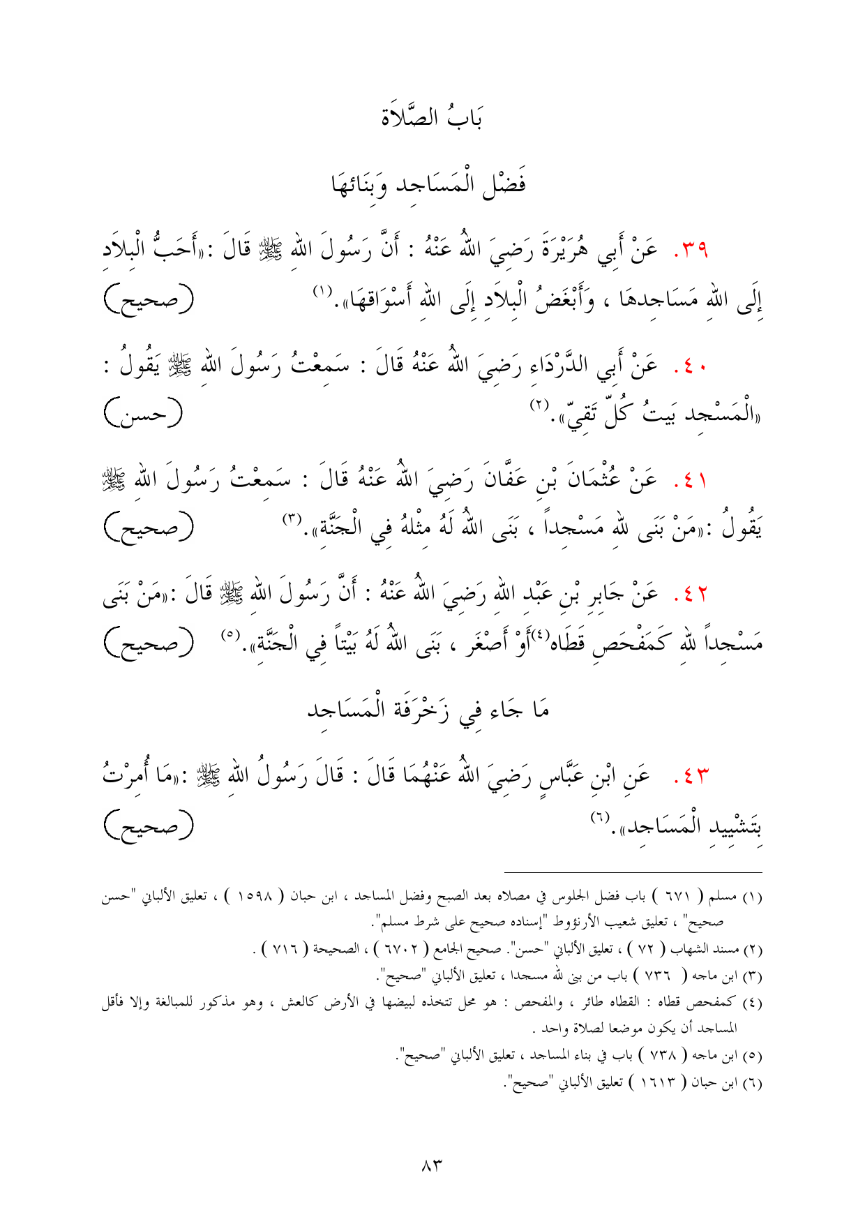 43 - عَنِ ابْنِ عَبَّاسٍ رَضِيَ اللهُ عَنْهُمَا قَالَ: قَالَ رَسُولُ اللهِ - صلى الله عليه وسلم -: «مَا أُمِرْتُ بِتَشْيِيدِ الْمَسَاجِد». (¬6) =صحيح