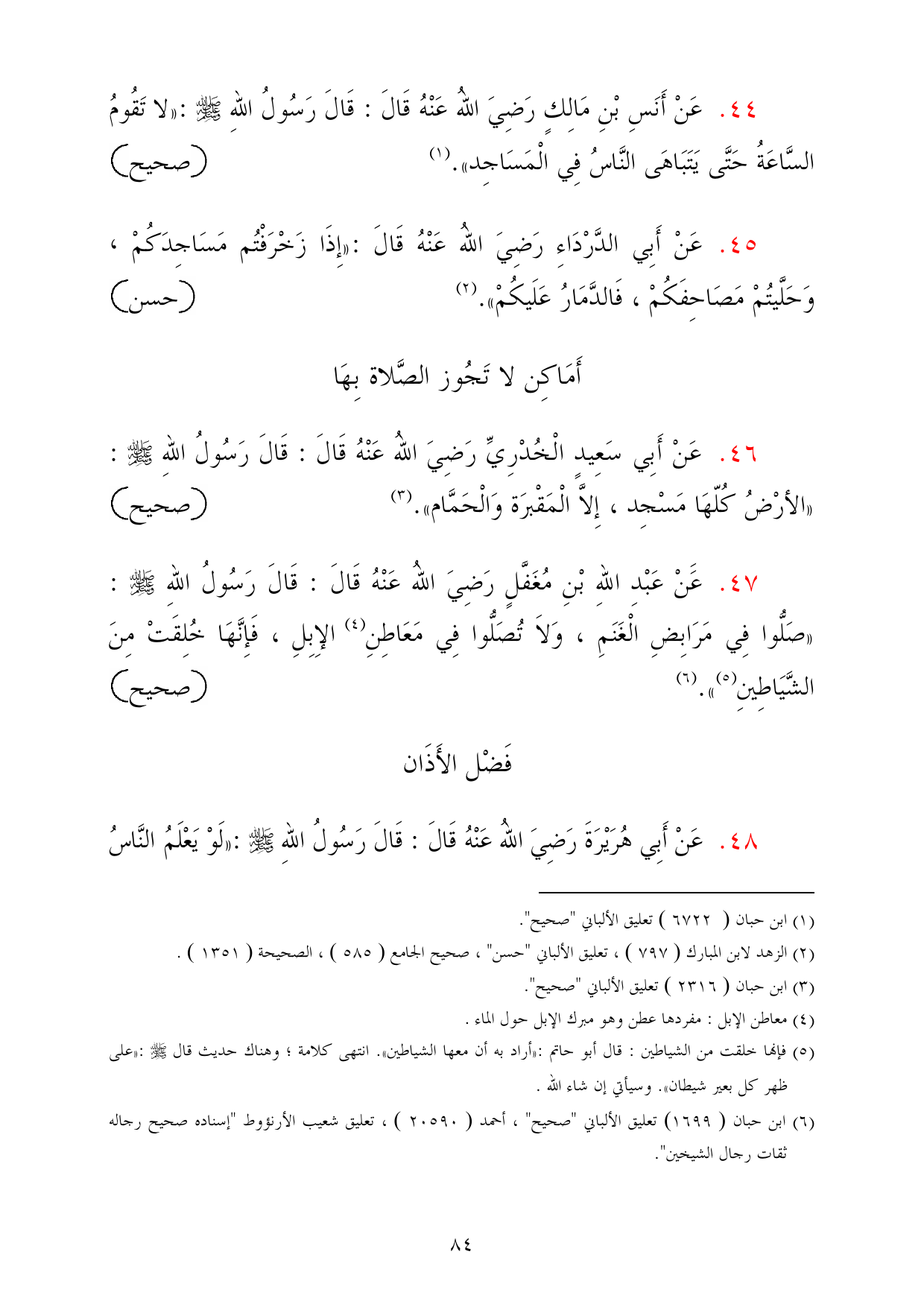 46 - عَنْ أَبِي سَعِيدٍ الْخُدْرِيِّ رَضِيَ اللهُ عَنْهُ قَالَ: قَالَ رَسُولُ اللهِ - صلى الله عليه وسلم -: «الأرْضُ كُلّهَا مَسْجِد، إِلاَّ الْمَقْبرَة وَالْحَمَّام». (¬3) =صحيح