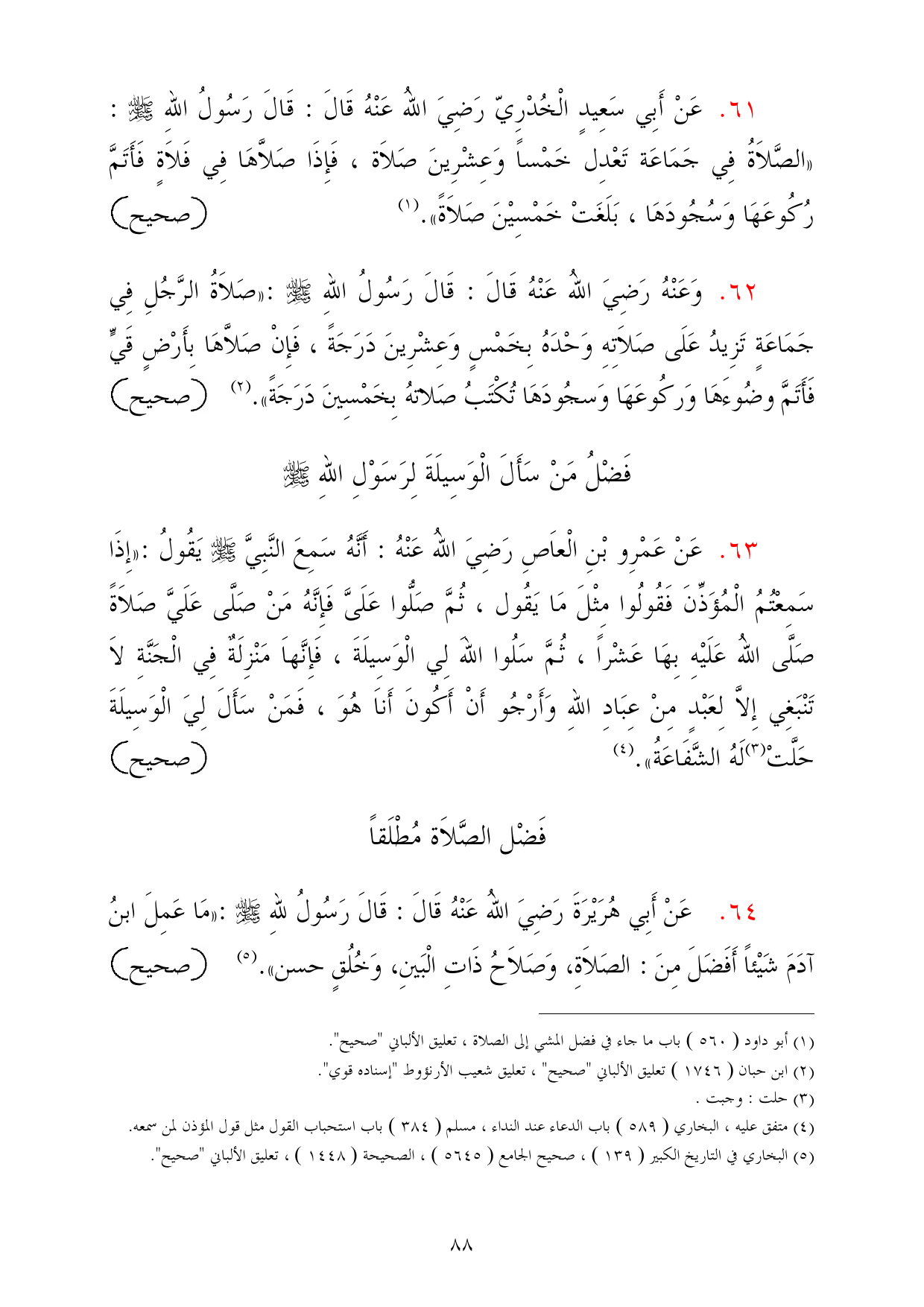 64 - عَنْ أَبِي هُرَيْرَةَ رَضِيَ اللهُ عَنْهُ قَالَ: قَالَ رَسُولُ للهِ - صلى الله عليه وسلم -: «مَا عَمِلَ ابنُ آدَمَ شَيْئاً أَفَضَلَ مِنَ: الصَلاَةِ، وَصَلاَحُ ذَاتِ الْبَينِ، وَخُلُقٍ حسن». (¬5) =صحيح