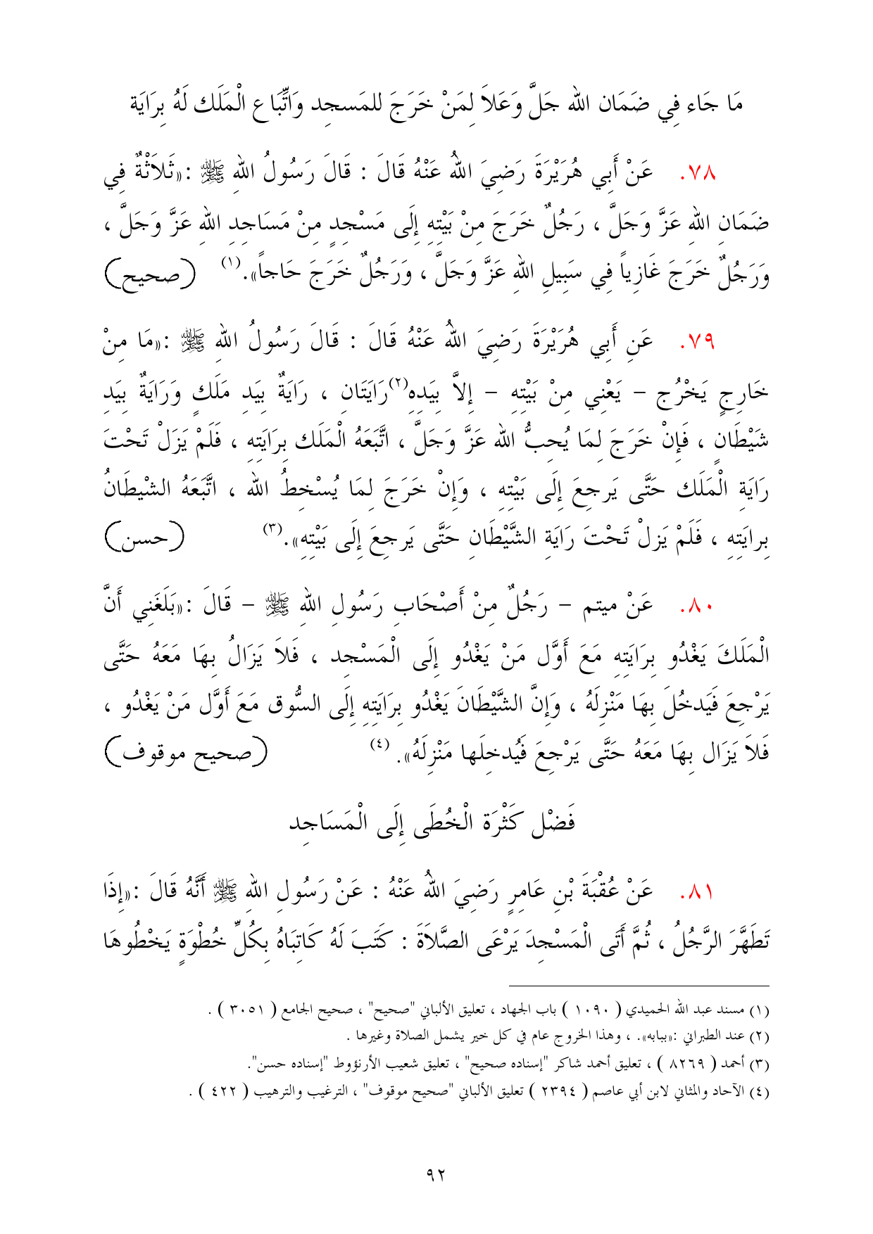 81 - عَنْ عُقْبَةَ بْنِ عَامِرٍ رَضِيَ اللهُ عَنْهُ: عَنْ رَسُولِ اللهِ - صلى الله عليه وسلم - أَنَّهُ قَالَ: «إِذَا تَطَهَّرَ الرَّجُلُ، ثُمَّ أَتَى الْمَسْجِدَ يَرْعَى الصَّلاَةَ: كَتَبَ لَهُ كَاتِبَاهُ بِكُلِّ خُطْوَةٍ يَخْطُوهَا