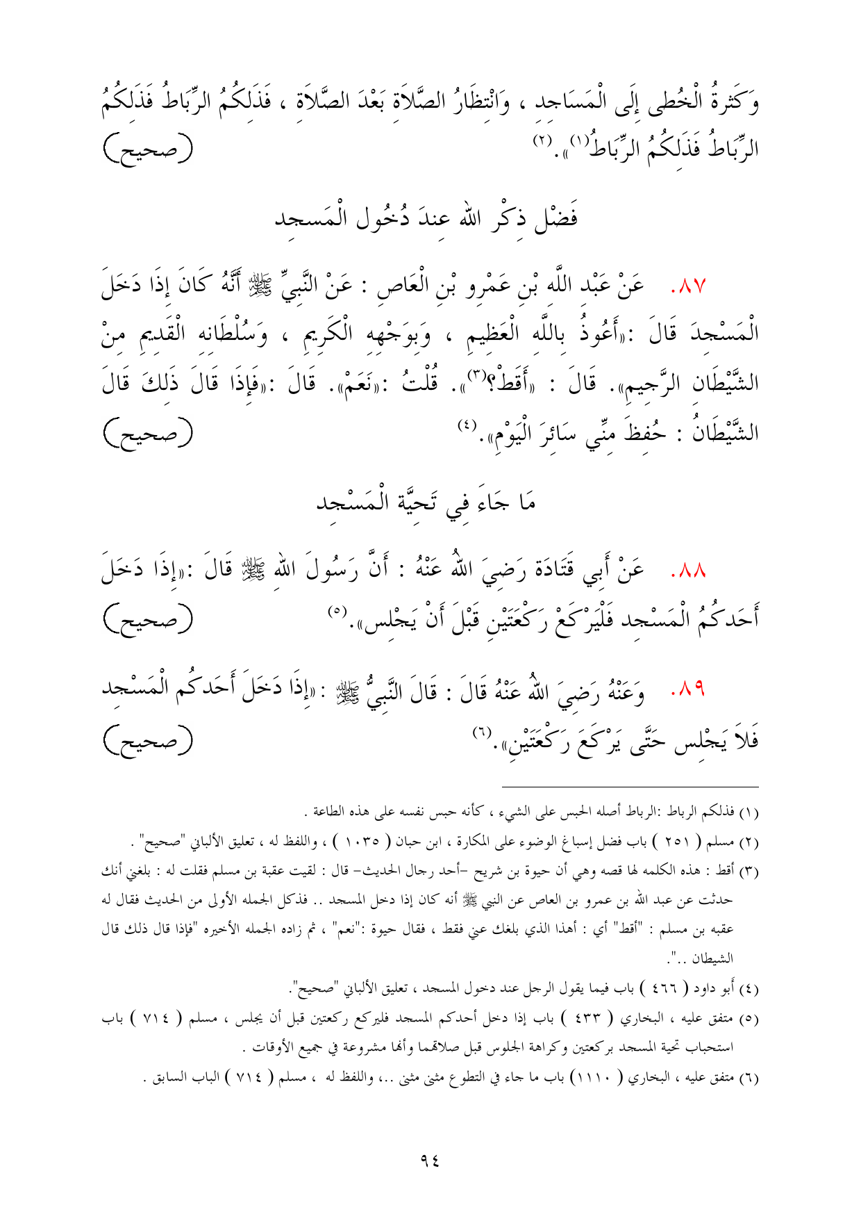 88 - عَنْ أَبِي قَتَادَة رَضِيَ اللهُ عَنْهُ: أَنَّ رَسُولَ اللهِ - صلى الله عليه وسلم - قَالَ: «إِذَا دَخَلَ أَحَدكُمُ الْمَسْجِد فَلْيَرْكَعْ رَكْعَتَيْنِ قَبْلَ أَنْ يَجْلِس». (¬5) =صحيح