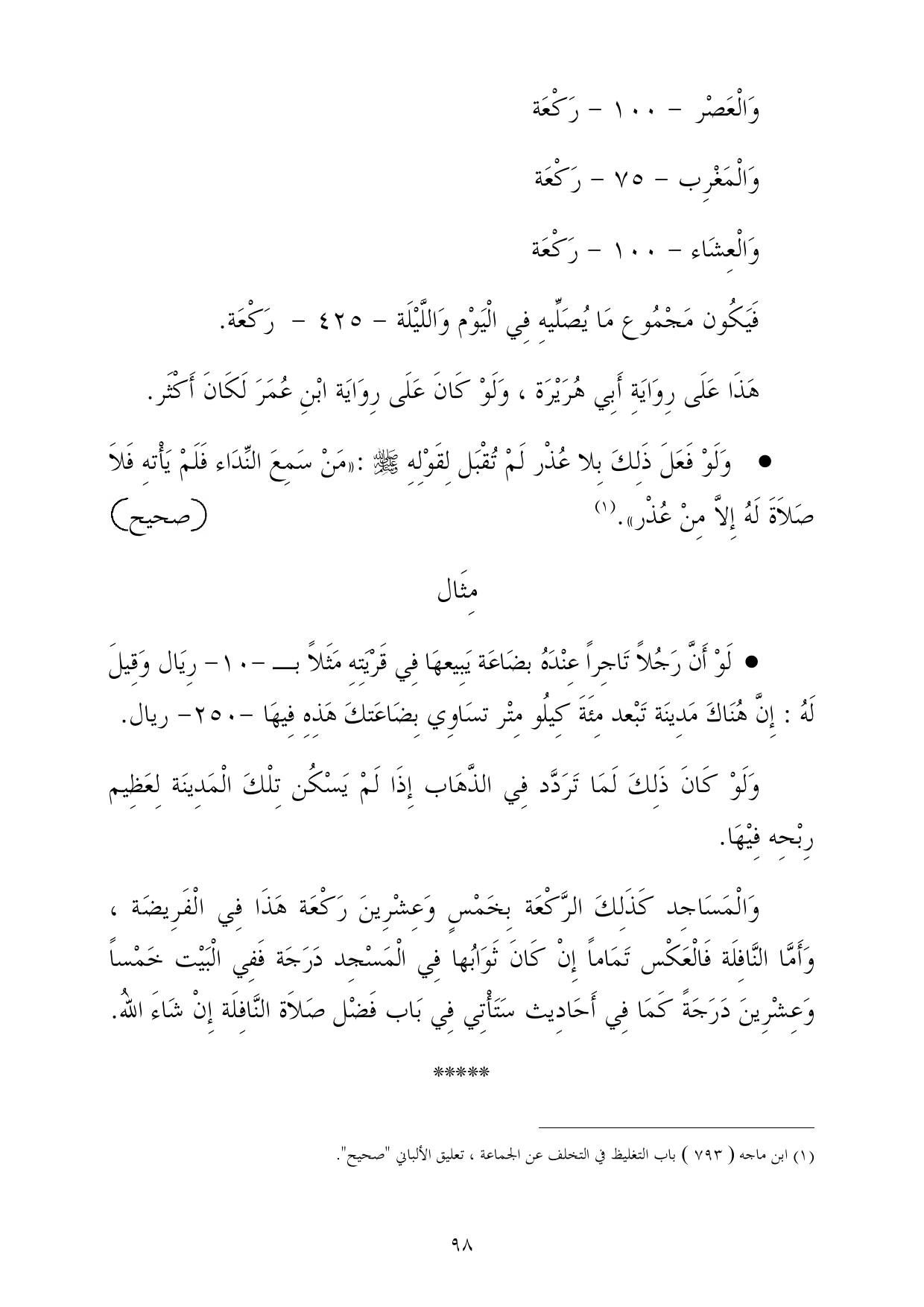 فَيَكُون مَجْمُوع مَا يُصَلِّيهِ فِي الْيَوْم وَاللَّيْلَة - 425 - رَكْعَة.