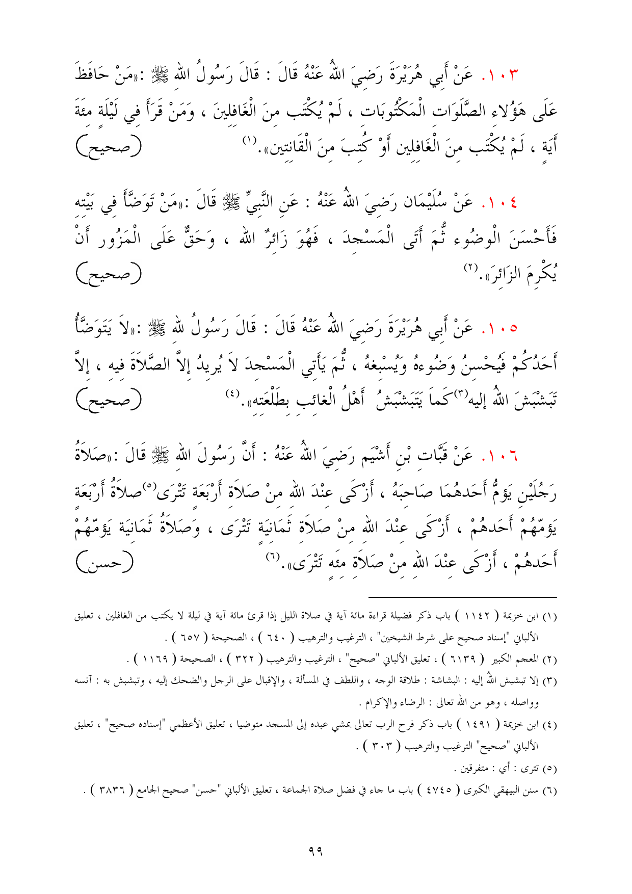104 - عَنْ سُلَيْمَان رَضِيَ اللهُ عَنْهُ: عَنِ النَّبِيِّ - صلى الله عليه وسلم - قَالَ: «مَنْ تَوَضَّأَ فِي بَيْتِهِ فَأَحْسَنَ الْوضُوء ثُّمَ أَتَى الْمَسْجِدَ، فَهُوَ زَائِرٌ الله، وَحَقٌّ عَلَى الْمَزُور أَنْ يُكْرِمَ الزَائِرَ». (¬2) =صحيح