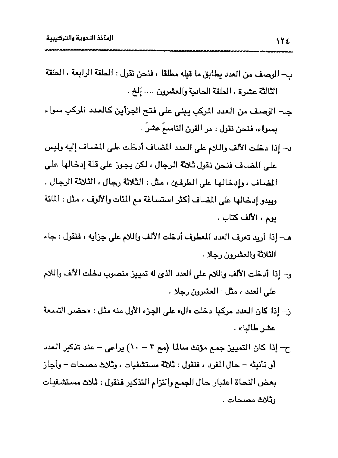 د- إذا دخلت الألف واللام على العدد المضاف أدخلت على المضاف إليه وليس على المضاف فنحن نقول ثلاثة الرجال، لكن يجوز على قلة إدخالها على المضاف، وإدخالها على الطرفين مثل: الثلاثة رجال، الثلاثة الرجال. ويبدو إدخالها على المضاف أكثر: استساغة مع المئات والألوف، مثل: المائة يوم، الألف كتاب.
