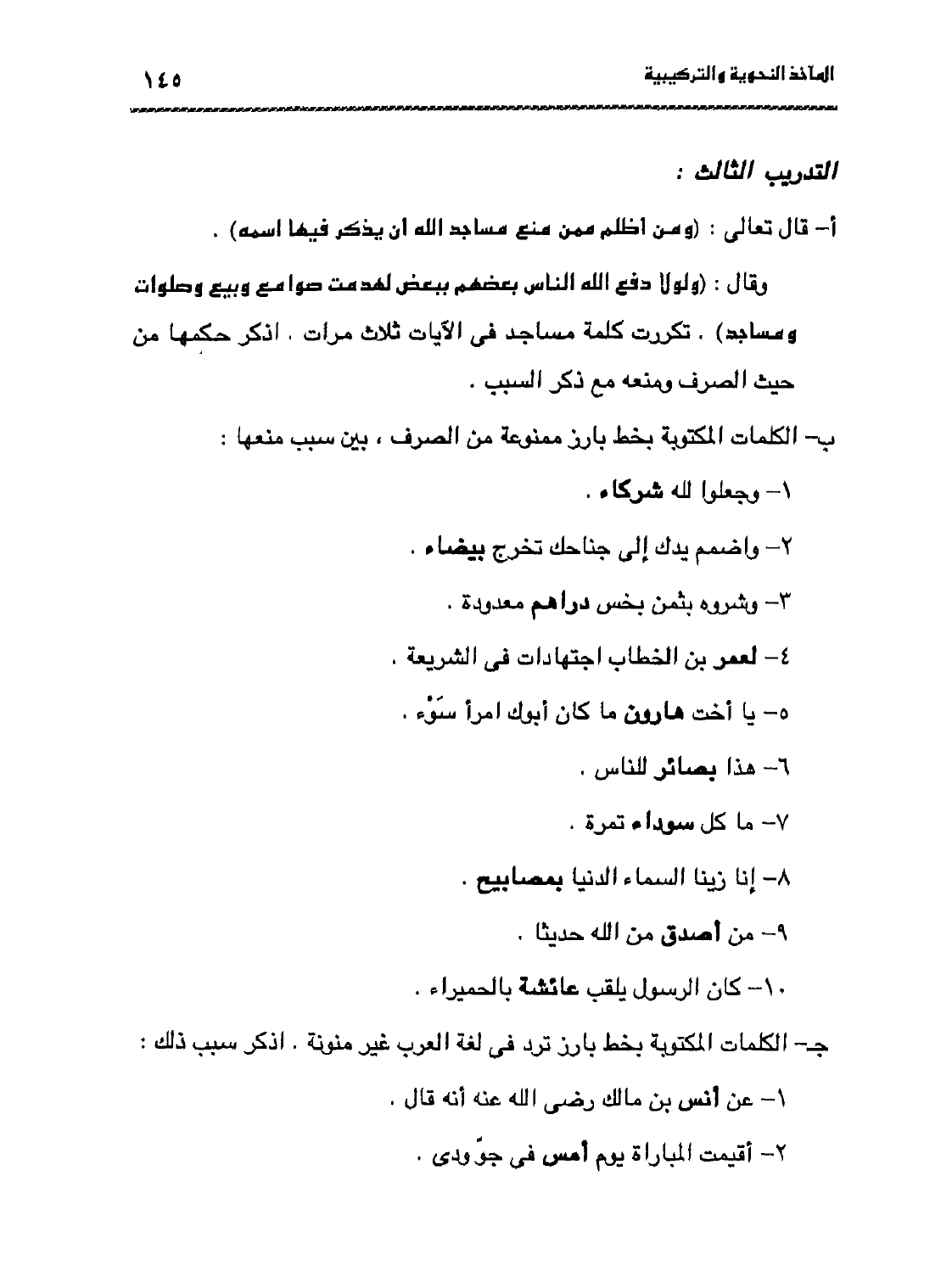 ب- الكلمات المكتوبة بخط بارز ممنوعة من الصرف، بين سبب منعها: