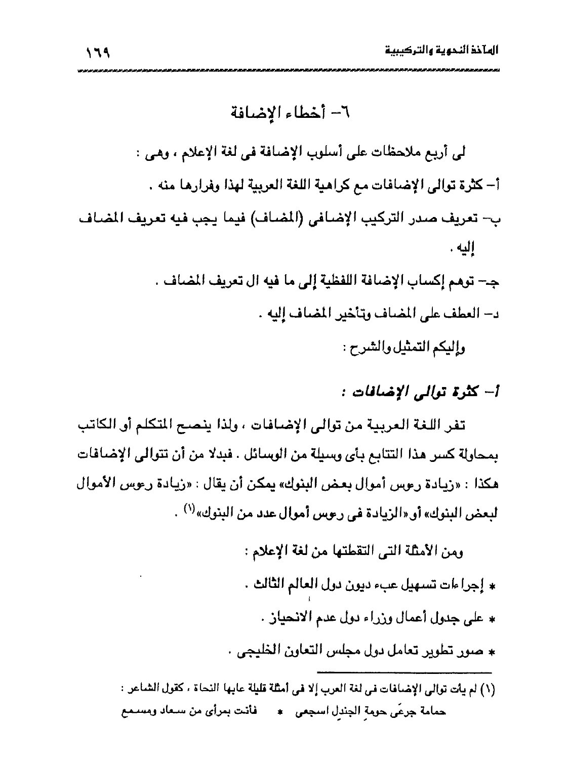 1 لم يأت توالي الإضافات في لغة العرب إلا في أمثلة قليلة عابها النحاة، كقول الشاعر:
