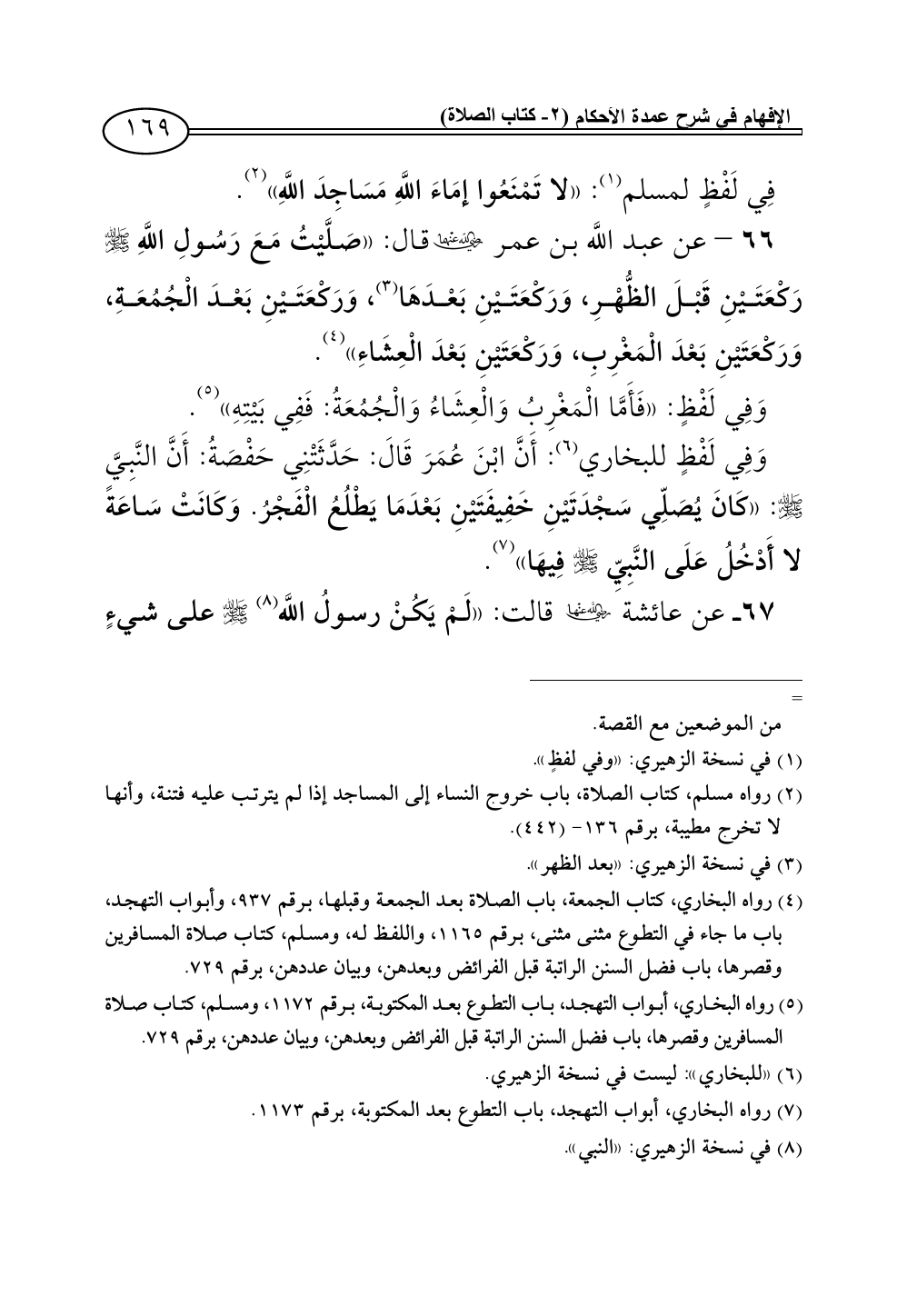 وَفِي لَفْظٍ للبخاري (¬6): أَنَّ ابْنَ عُمَرَ قَالَ: حَدَّثَتْنِي حَفْصَةُ: أَنَّ النَّبِيَّ - صلى الله عليه وسلم -: «كَانَ يُصَلِّي سَجْدَتَيْنِ خَفِيفَتَيْنِ بَعْدَمَا يَطْلُعُ الْفَجْرُ. وَكَانَتْ سَاعَةً لا أَدْخُلُ عَلَى النَّبِيِّ - صلى الله عليه وسلم - فِيهَا» (¬7).